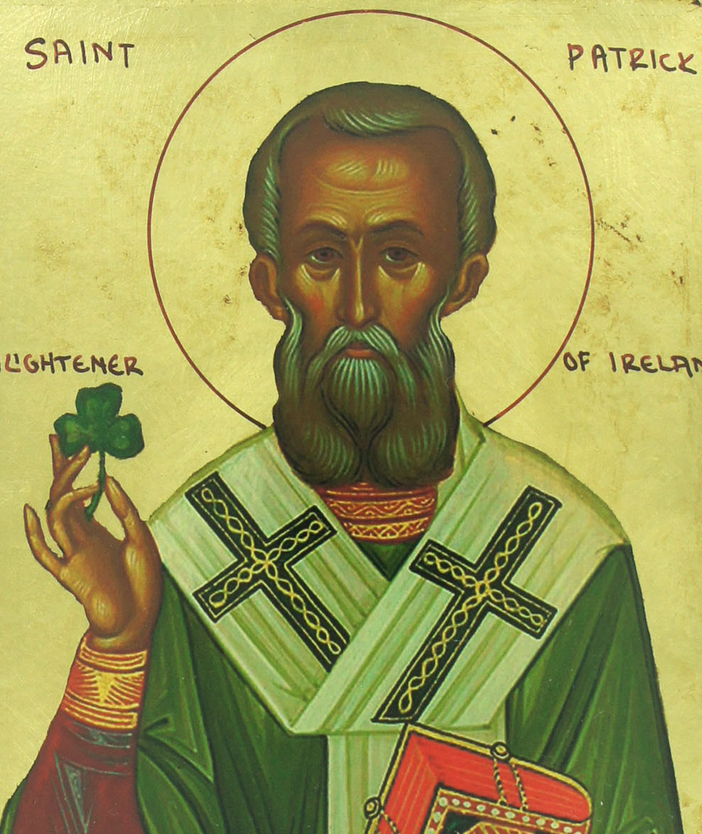 Icona da parete raffigurante San Patrizio (Saint Patrick), figura molto popolare della cristianità irlandese e santo patrono d'Irlanda, di Boston e di New York, celebrato in tutto il mondo il 17 marzo. S. Patrizio, considerato l'Evangelizzatore dell'Irlanda, è qui rappresentato in vesti di color verde, tiene in mano il simbolico trifoglio (elemento da lui adottato per spiegare il concetto di Trinità durante la sua opera di evangelizzazione) ed è definito con l'iscrizione "Enlightener of Ireland". Nella mano sinistra tiene, invece, il libro delle Sacre Scritture, simbolo della parola del Signore da lui professata.