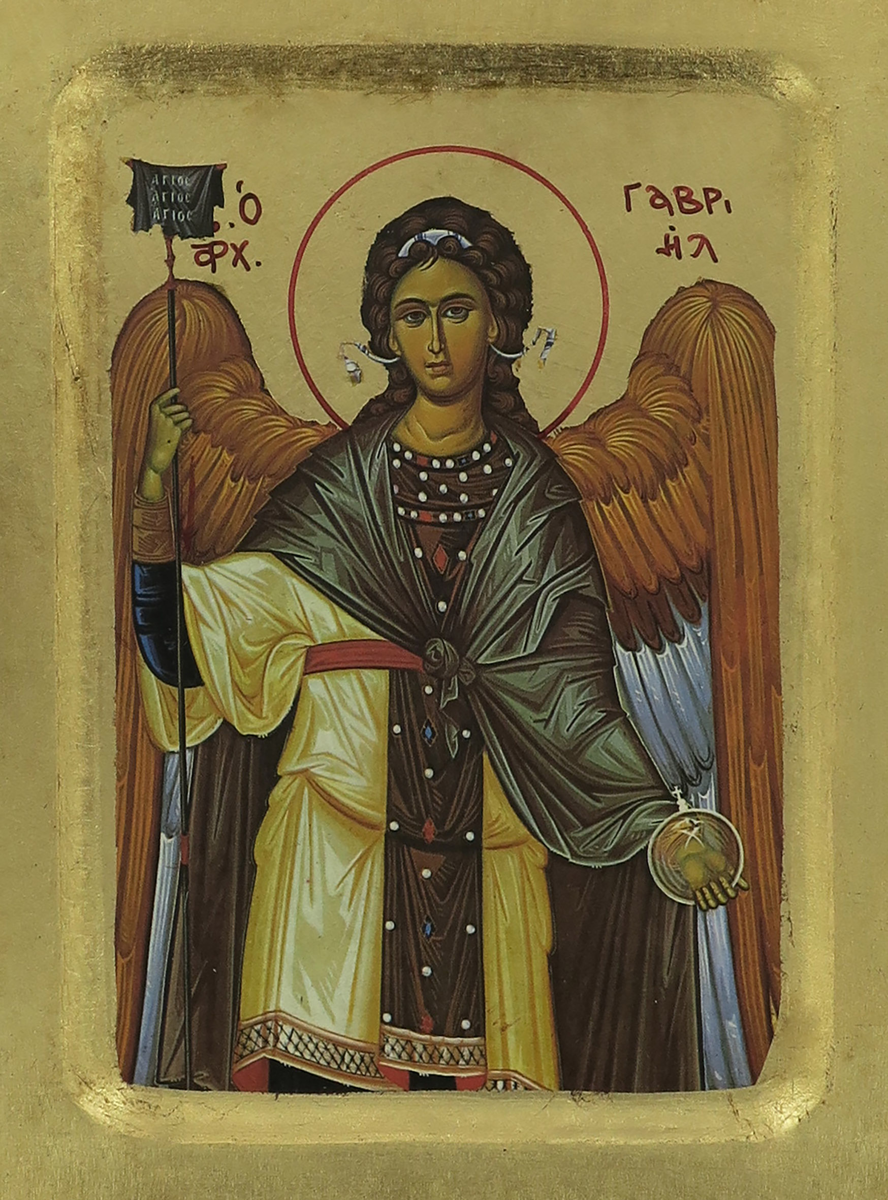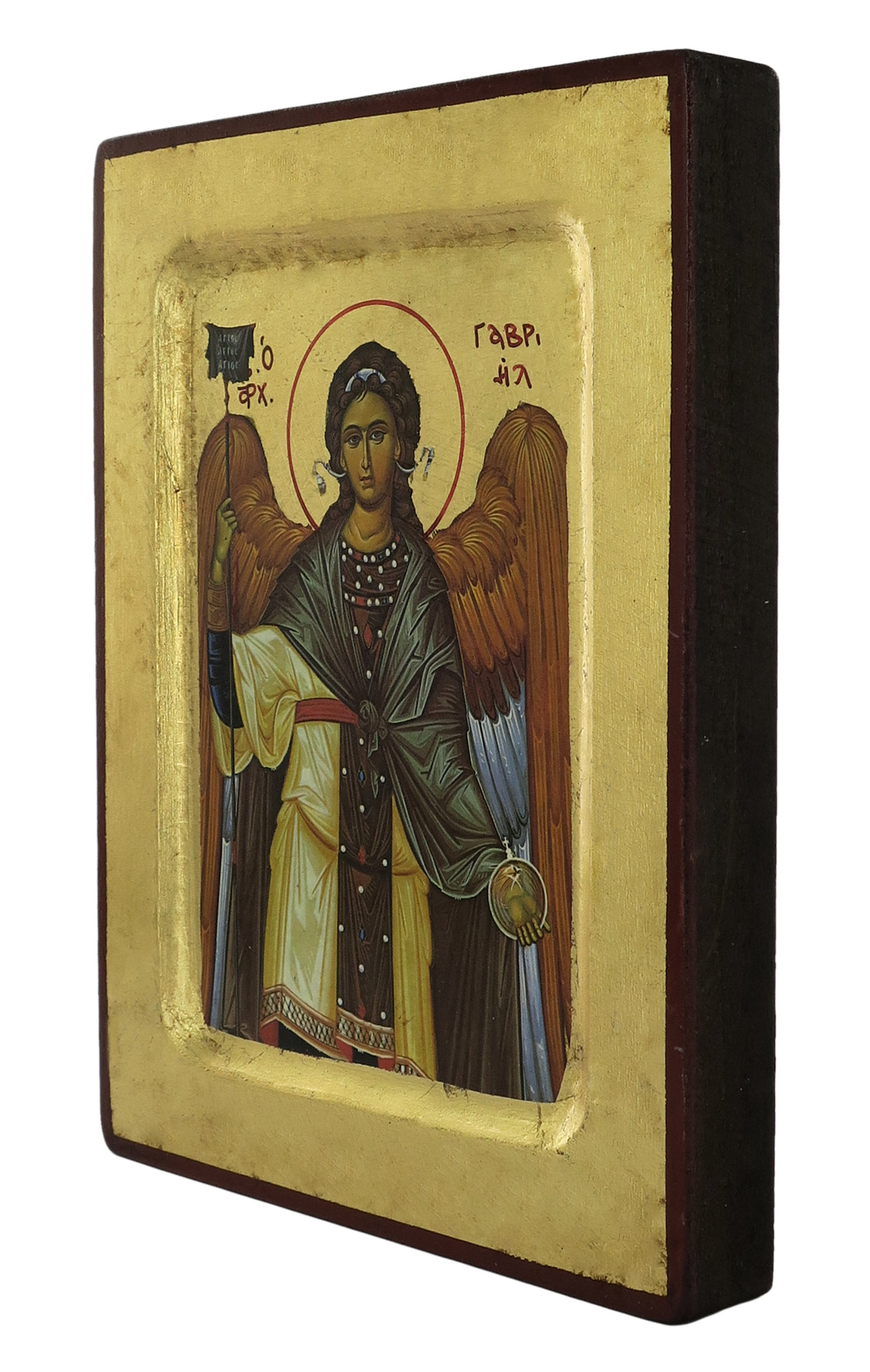 Icona da parete, di forma rettangolare, che raffigura San Gabriele, l'Arcangelo messaggero che diede l'annuncio dell'Incarnazione del Figlio di Dio alla Vergine Maria, con le parole «Rallégrati, piena di grazia: il Signore è con te [...]. Ed ecco, concepirai un figlio, lo darai alla luce e lo chiamerai Gesù. Sarà grande e verrà chiamato Figlio dell'Altissimo». S. Gabriele Arcangelo è celebrato il 29 settembre ed è patrono di ambasciatori, corrieri, giornalai e postini.