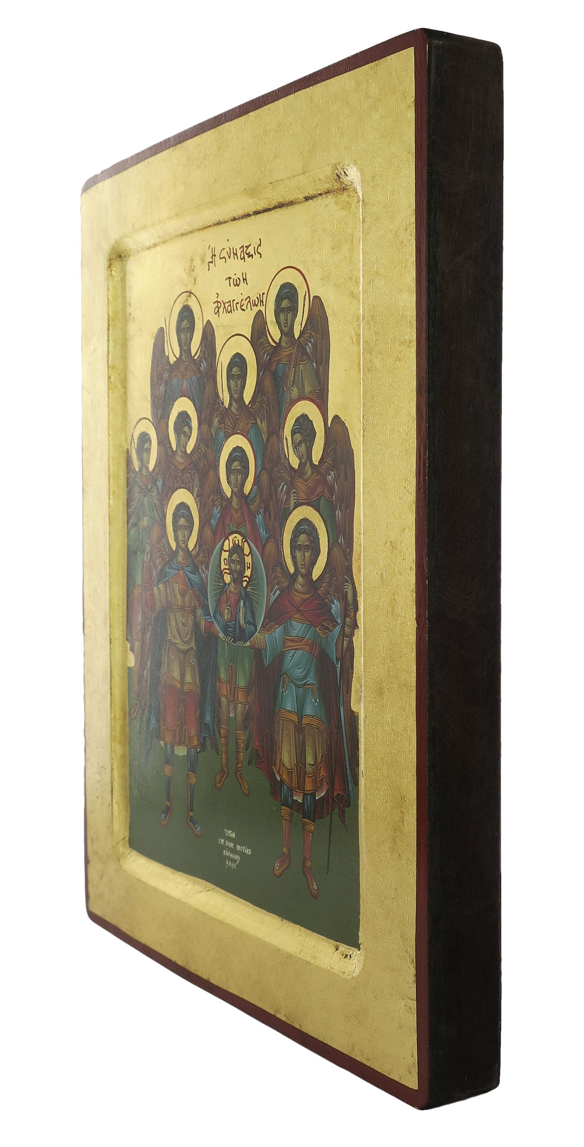 Icona Schiera Celeste, Icona in Stile Arte Bizantina, Icona su Legno Rifinita con Aureole, Scritte e Bordure Fatte a Mano, Produzione Greca - 25,5 x 19 Cm