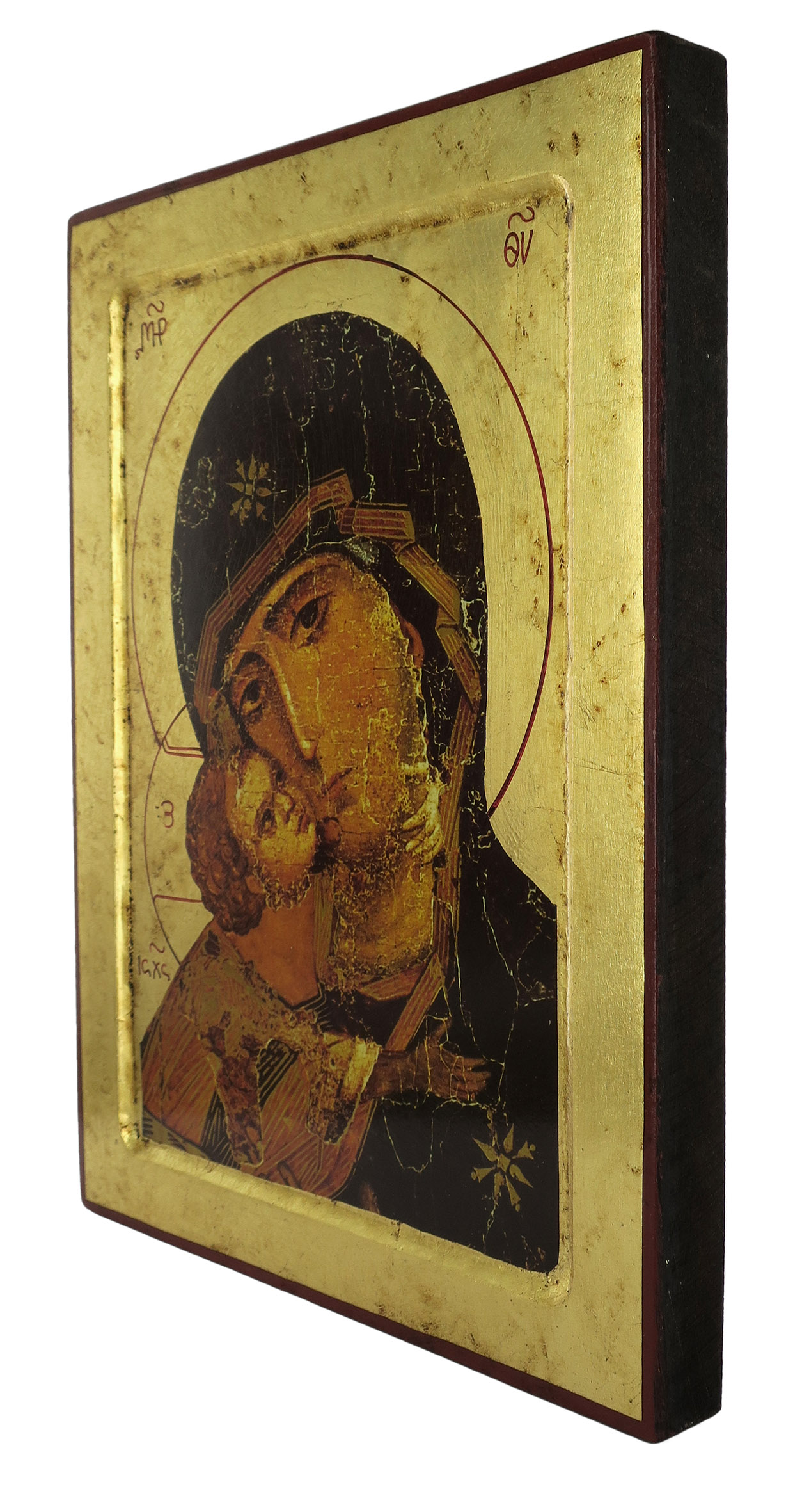 Icona Volto della Tenerezza, Madonna di Vladimir, Icona in Stile Arte Bizantina, Icona su Legno Rifinita con Aureole, Scritte e Bordure Fatte a Mano, Produzione Greca - 31,5 x 24,5 Cm
