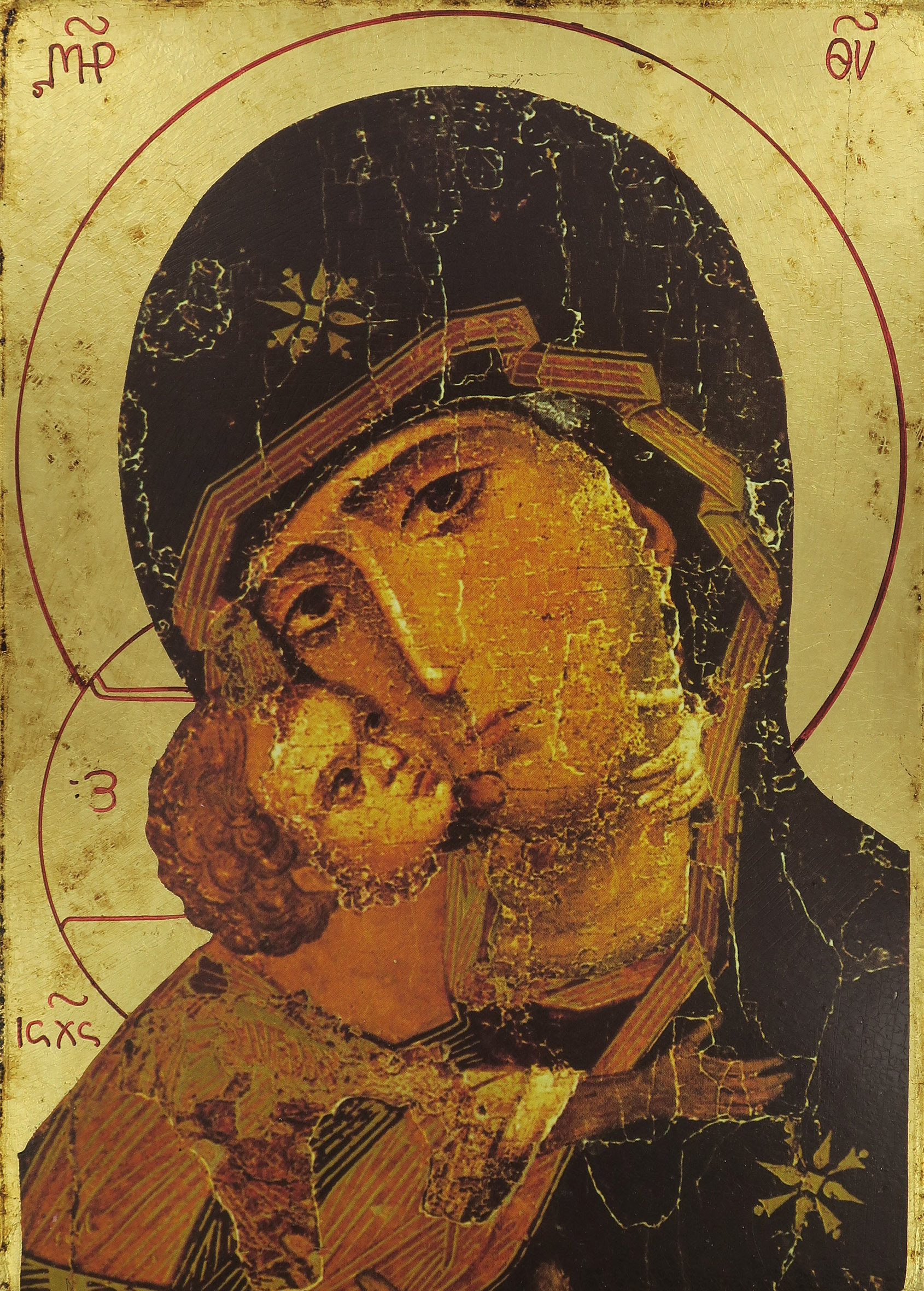 Grande icona da parete che raffigura il dettaglio del volto della Vergine della Tenerezza di Vladimir. Si tratta di una copia d'arte bizantina: l'icona originale della Madre di Dio della Tenerezza, a cui questa riproduzione si ispira, fu dipinta a Costantinopoli nel XII secolo ed è conservata a Mosca. Tra le icone ortodosse più venerate al mondo, la Theotókos ("Madre di Dio" in greco) è la figura protettrice della Russia.