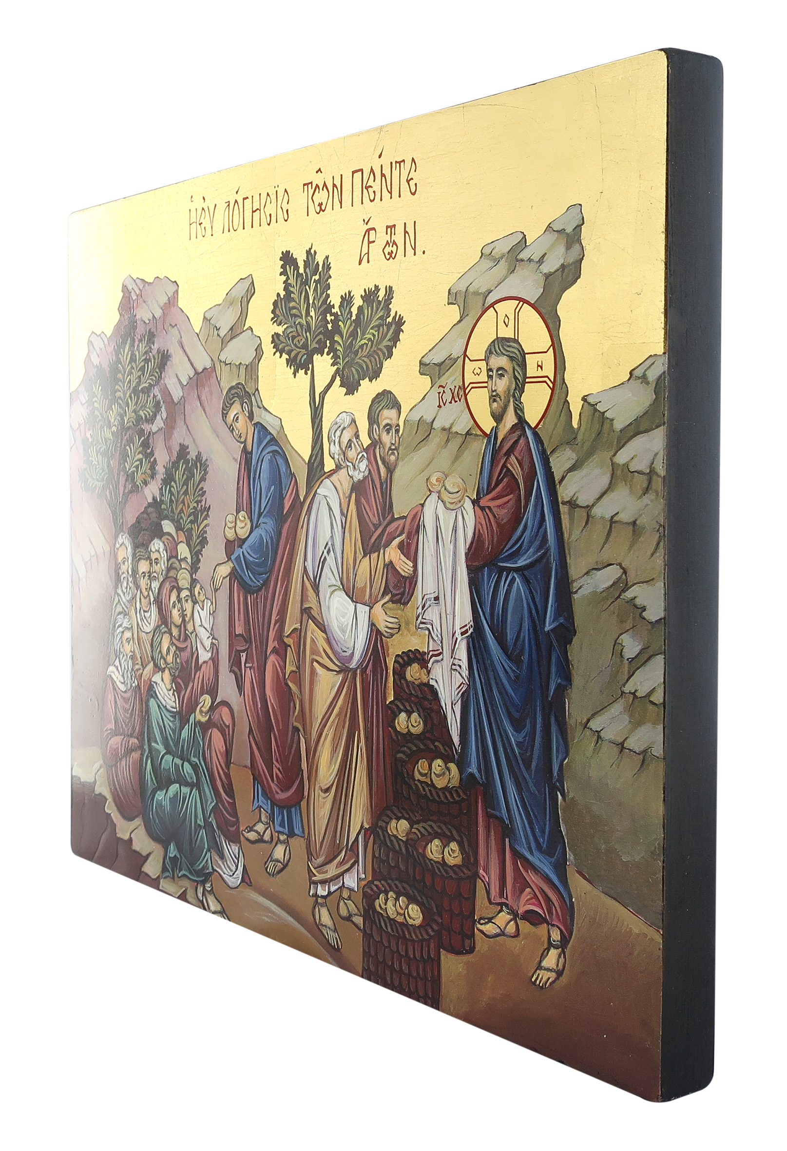 Icona raffigurante la Ditribuzione Pani Pesci dipinta a mano su legno con fondo oro cm 26x32.