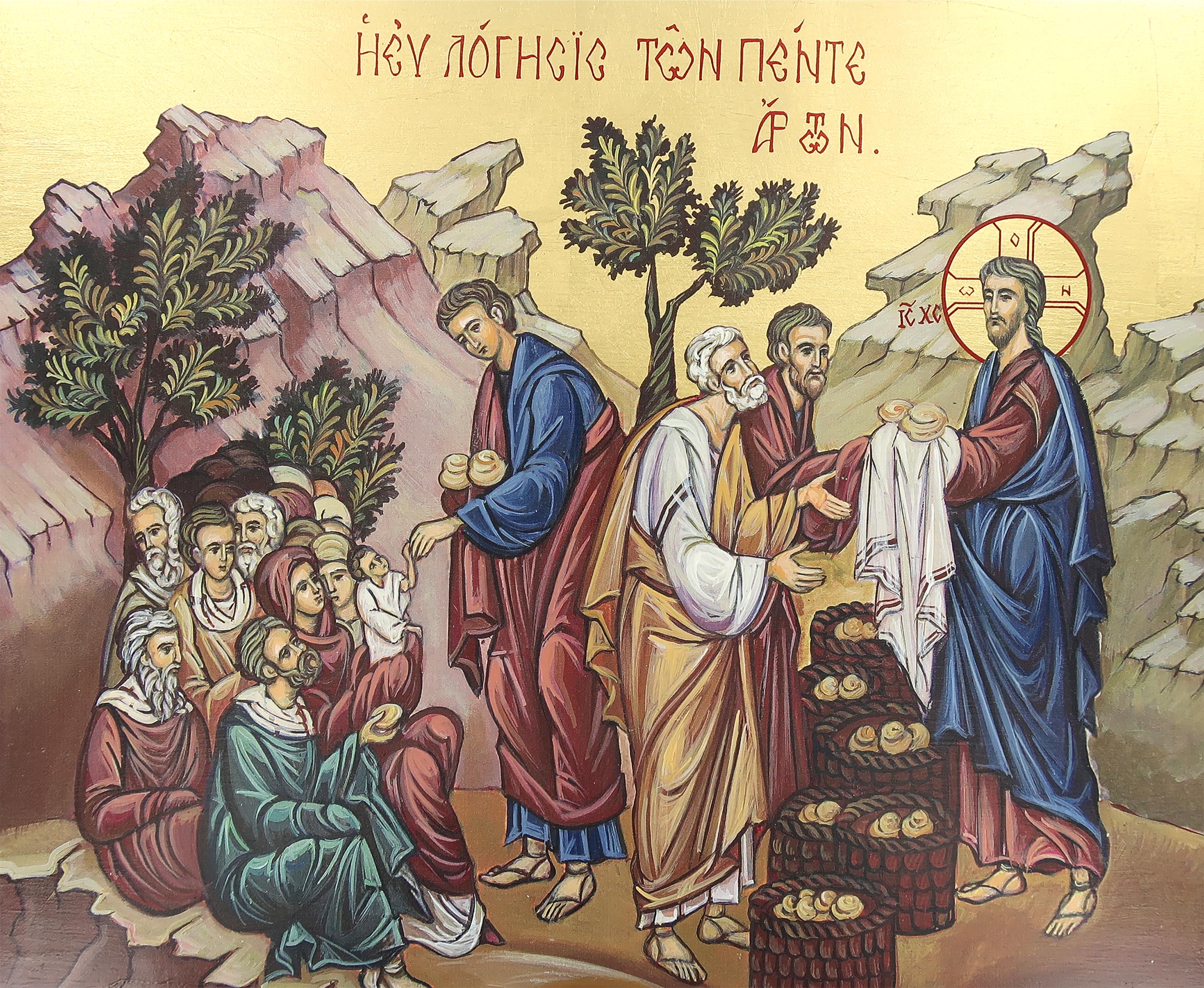 Icona Distribuzione Pani Pesci dipinta a mano su legno con fondo oro cm 26x32