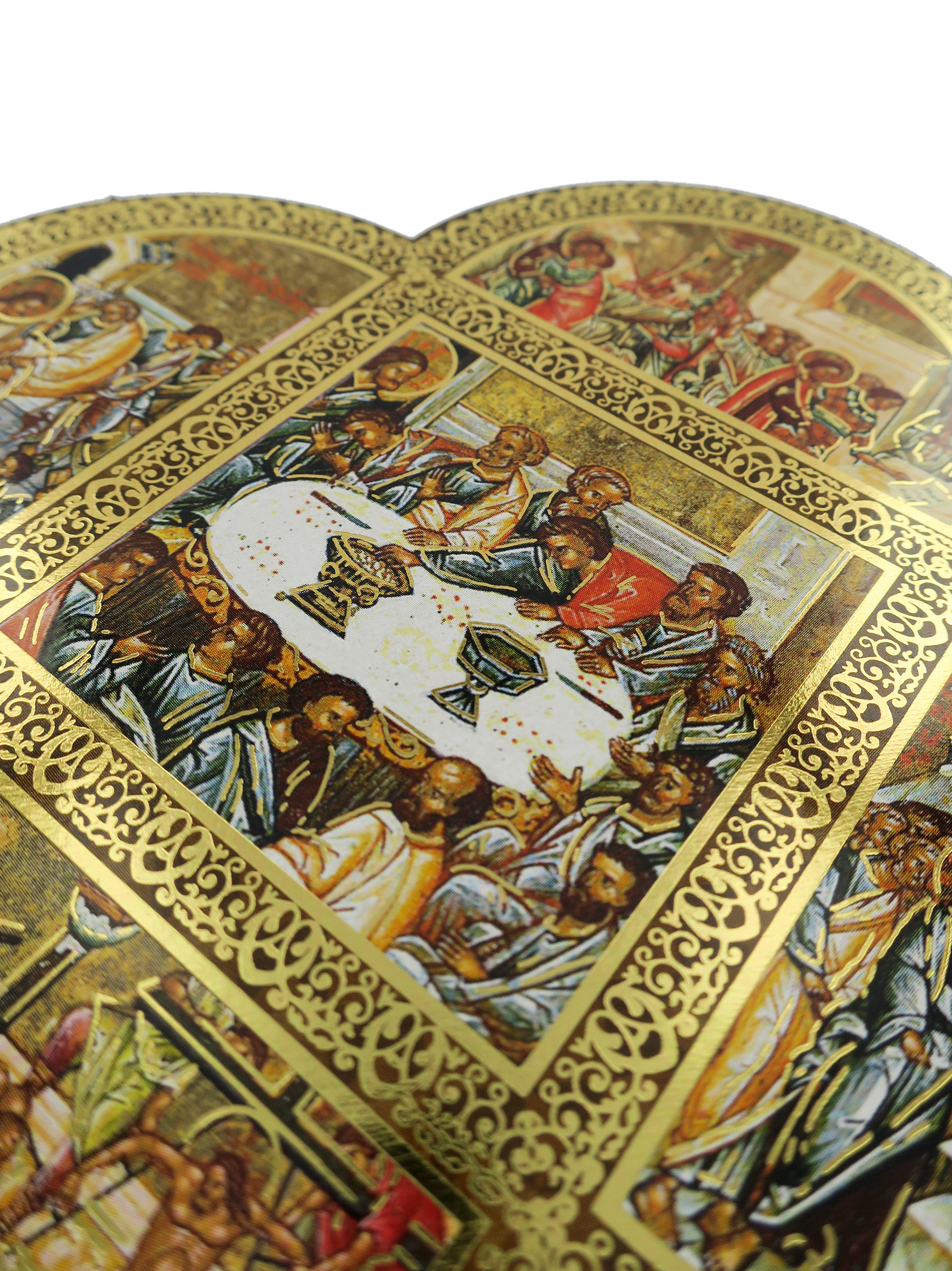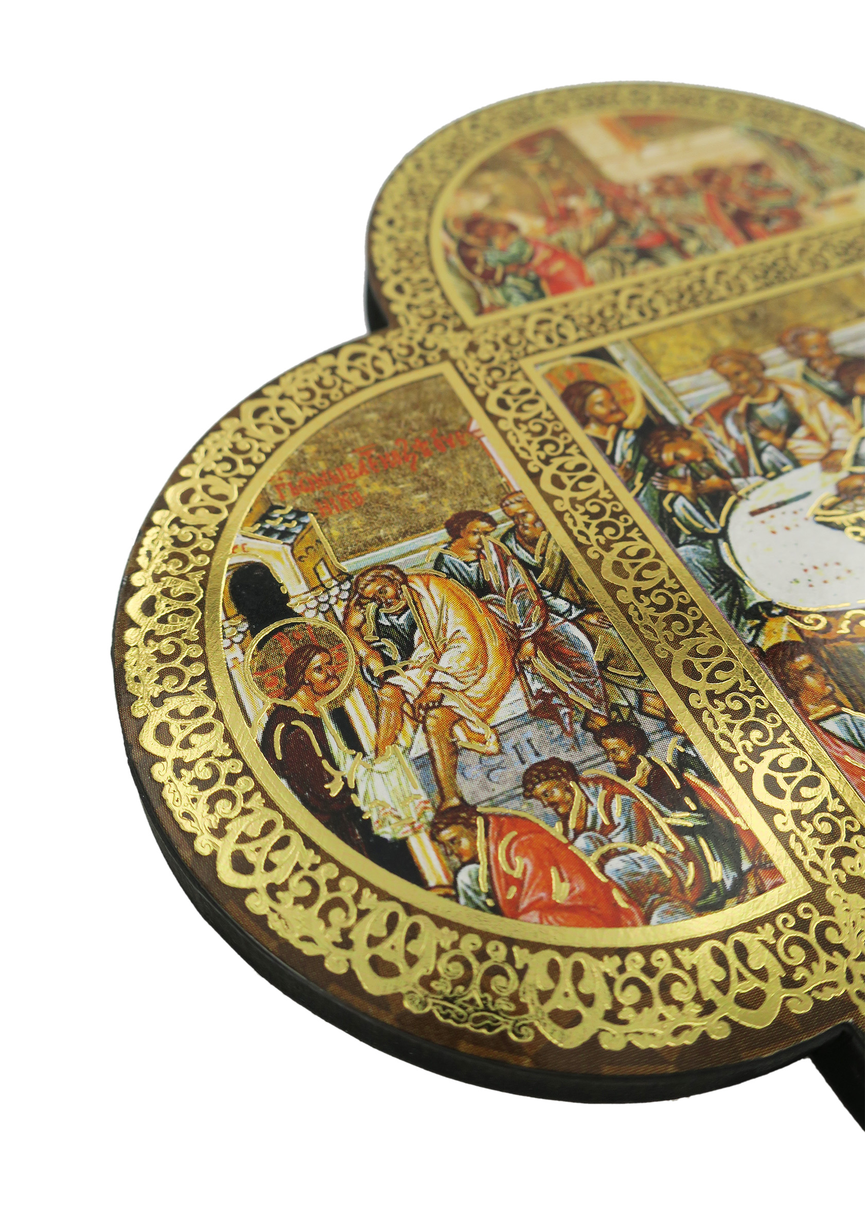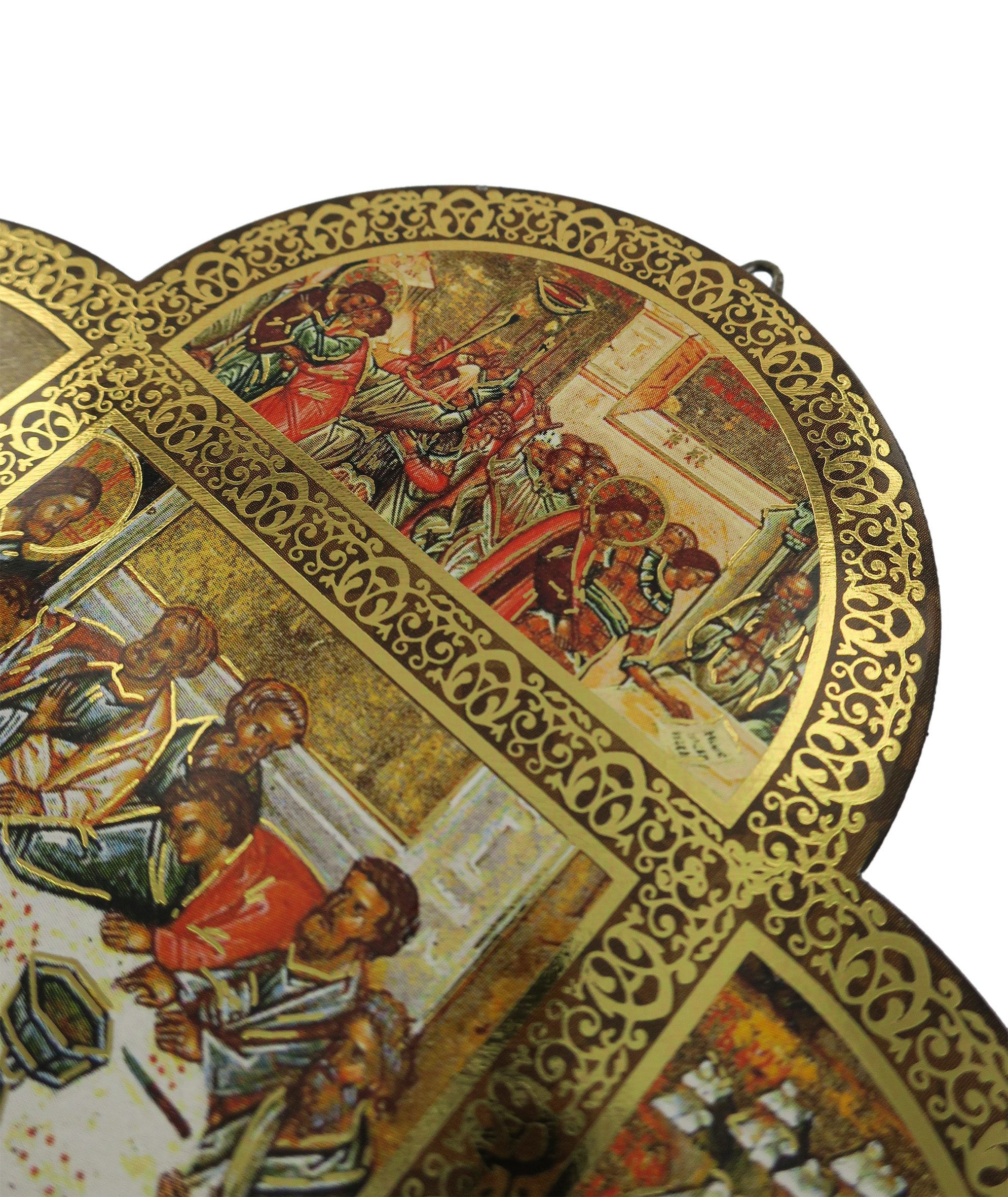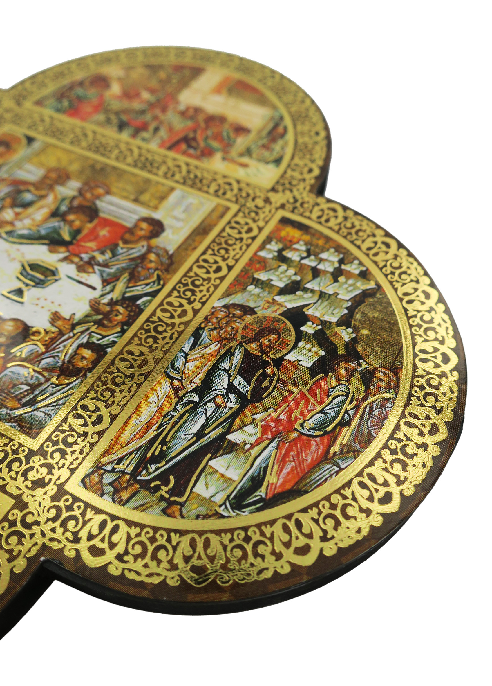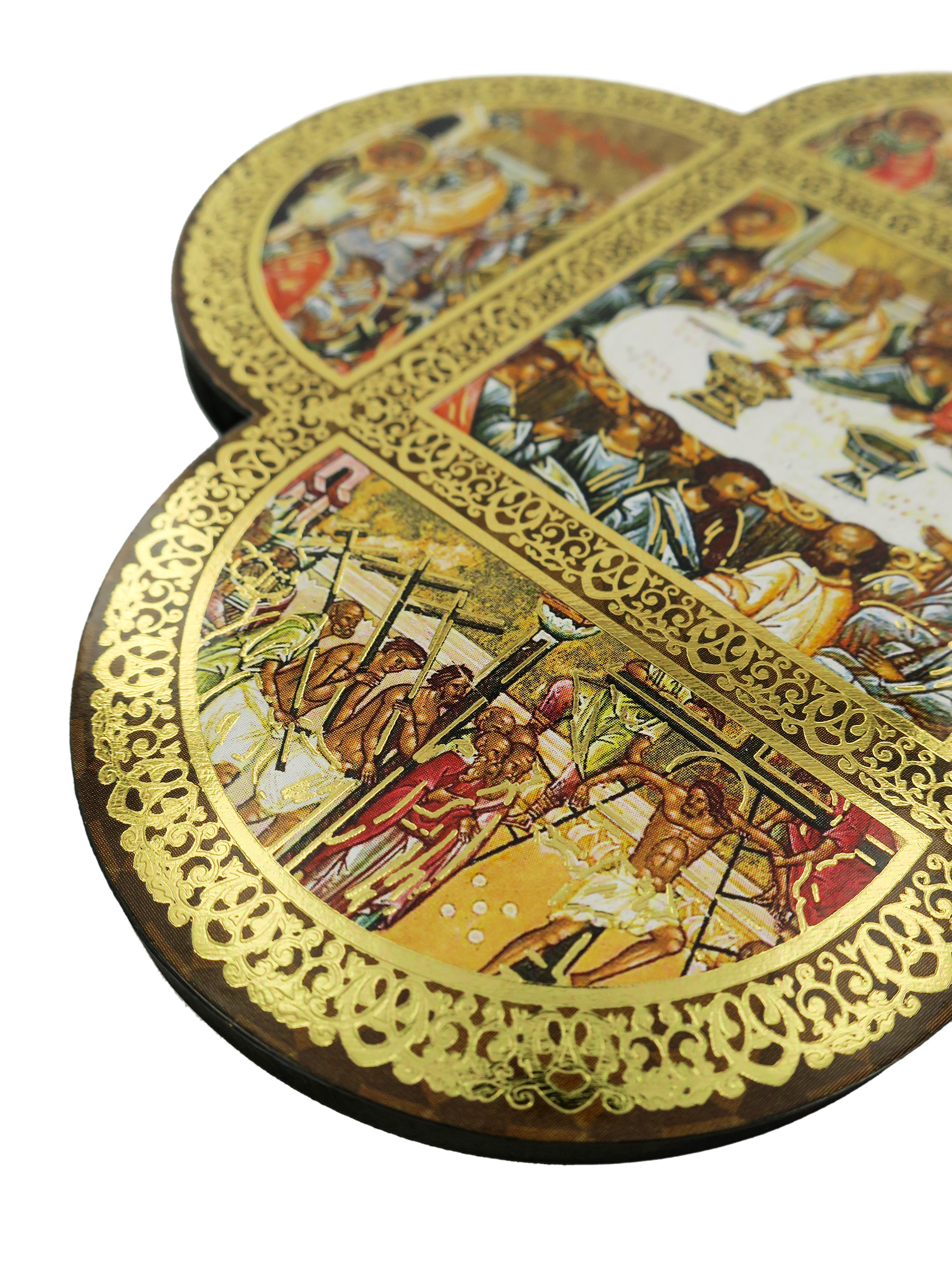 Croce in legno MDF con le 4 estremità arrotondate a semicerchio volte a delineare la forma caratteristica della Cristianità. La tavoletta a forma di croce è suddivisa in settori contornati da un intreccio decorativo color oro in cui sono raffigurate scene relative a Gesù Cristo. Le rappresentazioni sono stampe a colori (tra cui il color oro) su carta, poi applicate alla croce-icona in MDF.