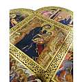 La parte quadrata centrale, più grande, mostra la figura della Vergine con il Bambino in braccio, custodita da angeli. Le altre scene laterali, invece, si riferiscono all'Annunciazione, alla nascita del Salvatore, alla fuga nel deserto e alla sua morte.