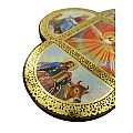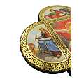 Croce in legno MDF con le 4 estremità arrotondate a semicerchio volte a delineare la forma caratteristica della Cristianità. La tavoletta a forma di croce è suddivisa in settori contornati da un intreccio decorativo color oro in cui sono raffigurati i quattro Evangelisti intendi a narrare la vita del Signore. Le rappresentazioni sono stampe a colori (tra cui il color oro) su carta, poi applicate alla croce-icona in MDF.