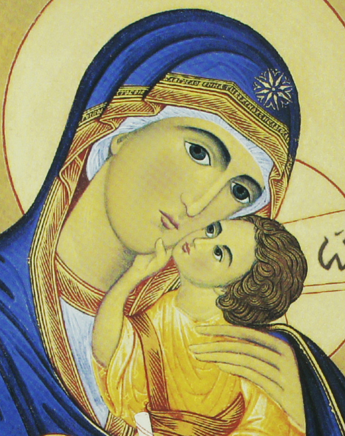 Tavola icona raffigurante la Madonna col Bambino in braccio. Questa immagine è una stampa su tavolo in legno con particolari dorati e blu.