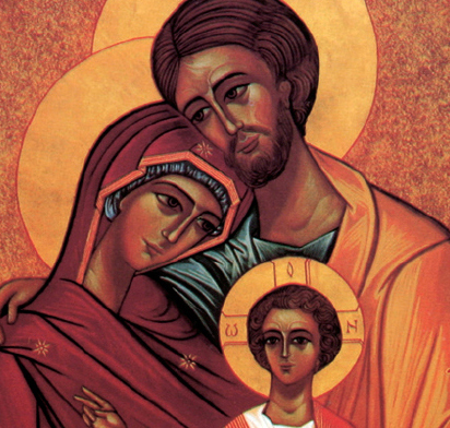 Icona raffigurante la Sacra Famiglia. Questa immagine è una stampa su tavolo in legno.