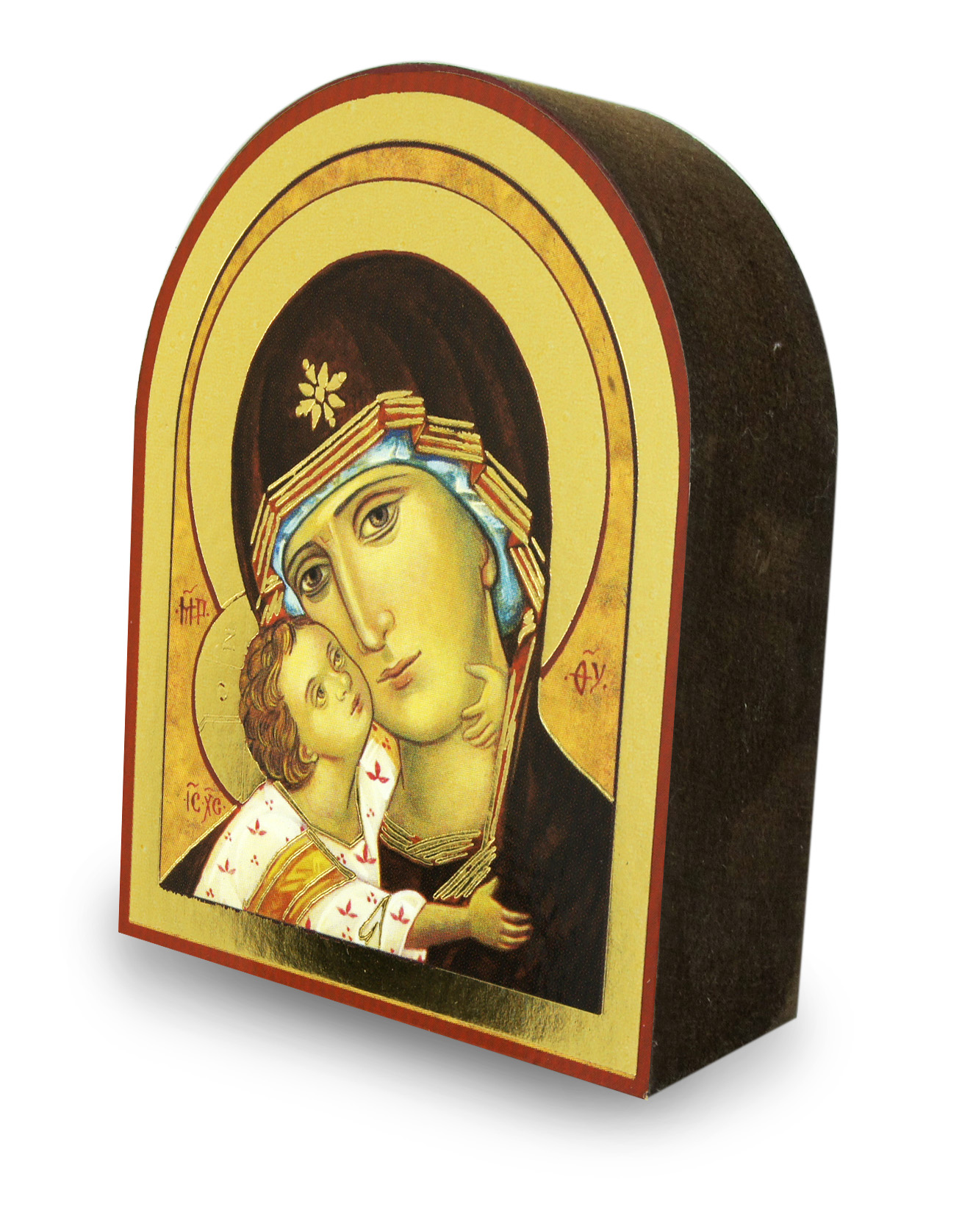 Quadro Madonna della Tenerezza con manto nero stampa su legno ad arco - 10 x 7,5 cm