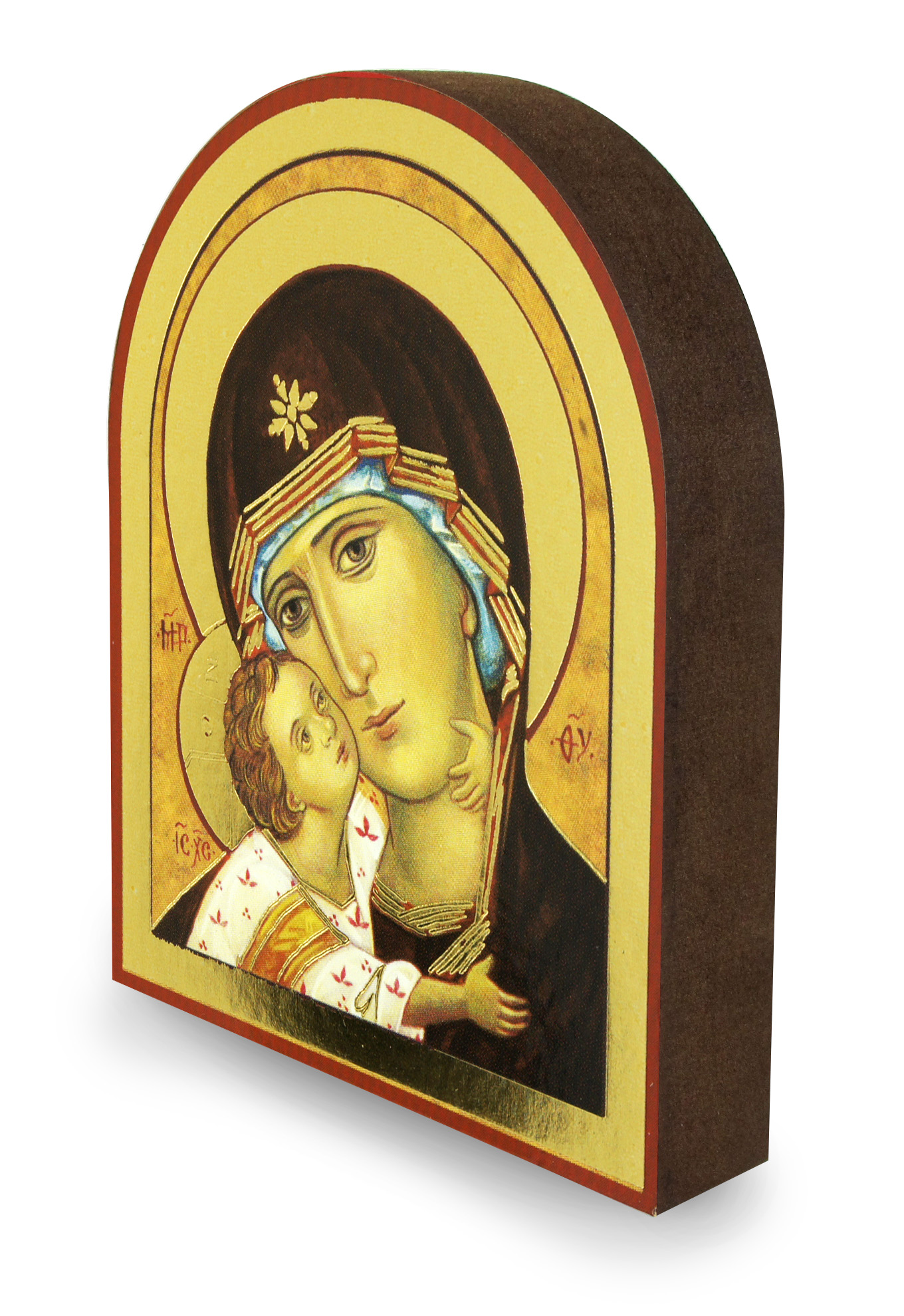 Quadro Madonna della Tenerezza con manto nero stampa su legno ad arco - 15 x 11,5 cm