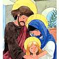 Tavola in legno raffigurante la Sacra Famiglia in stile infantile. L'immagine è una stampa su legno.