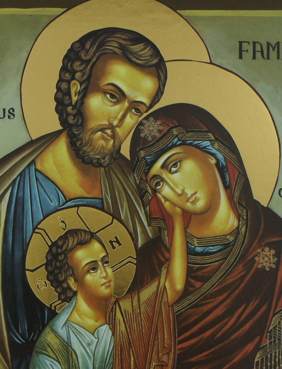 Stampa su tavola in legno raffigurante l'icona bizantina della Sacra Famiglia.