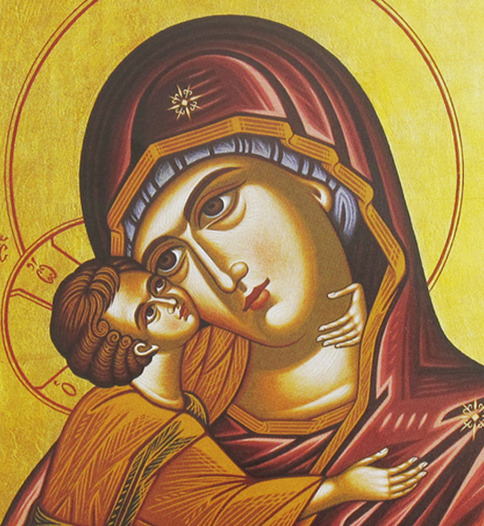 STOCK: L'icona ci presenta la Vergine con il bimbo Gesù in braccio che Maria con il sorriso ci mostra e ci dona. Si tratta di una copia d'arte bizantina e l'immagine è una stampa su legno.