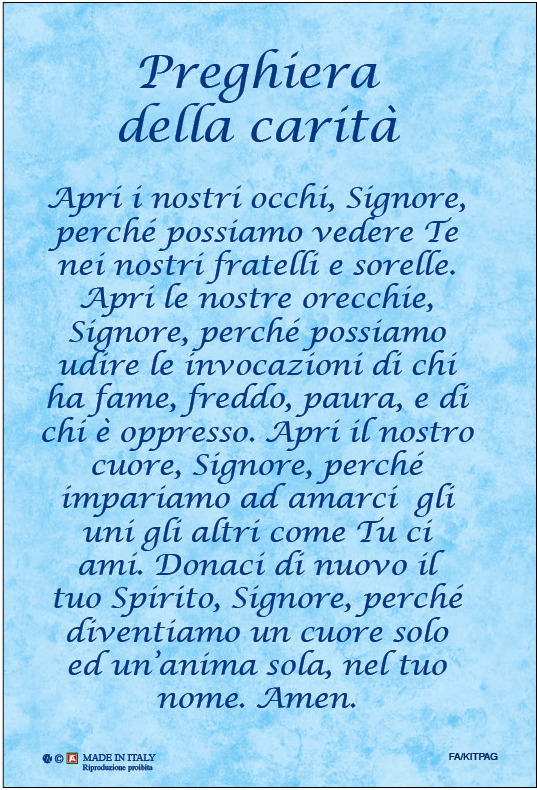 Sul retro del biglietto è stampata la preghiera della carità a lei ispirata.