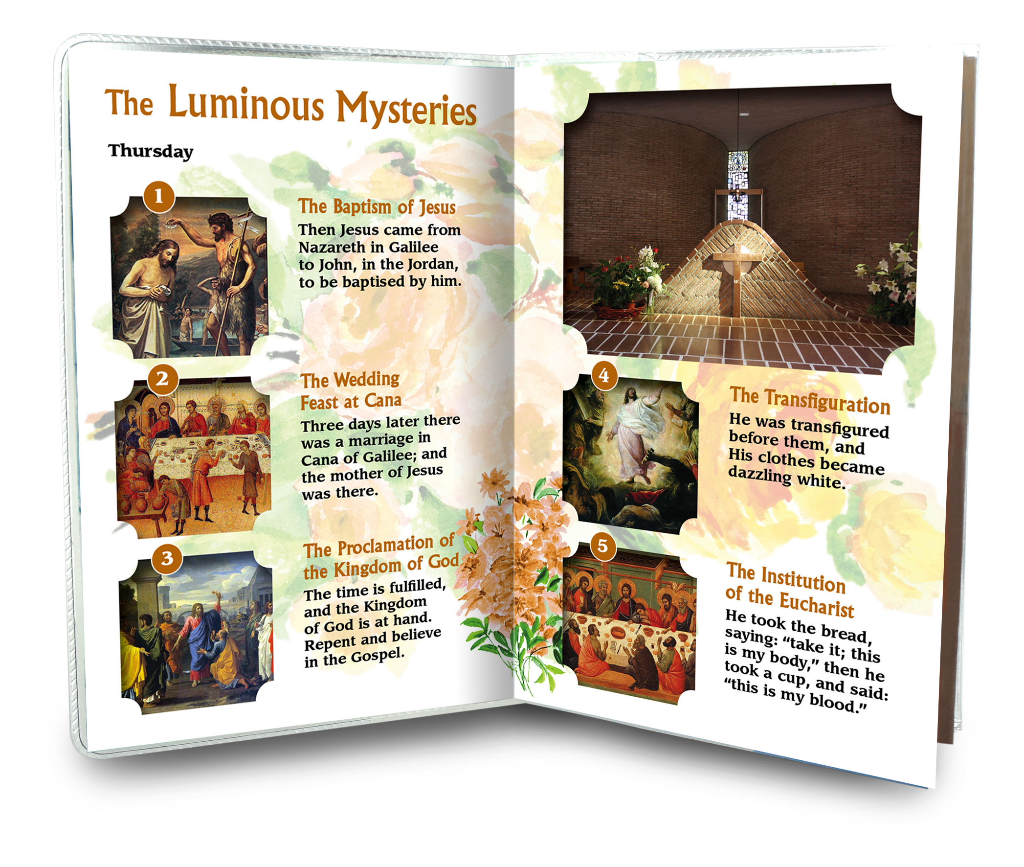 Il libretto, composto da 16 pagine, si presenta con una copertina in plastica trasparente e nell'interno vi è un piccolo rosario con i grani tipo perlina del diamero di mm 4.