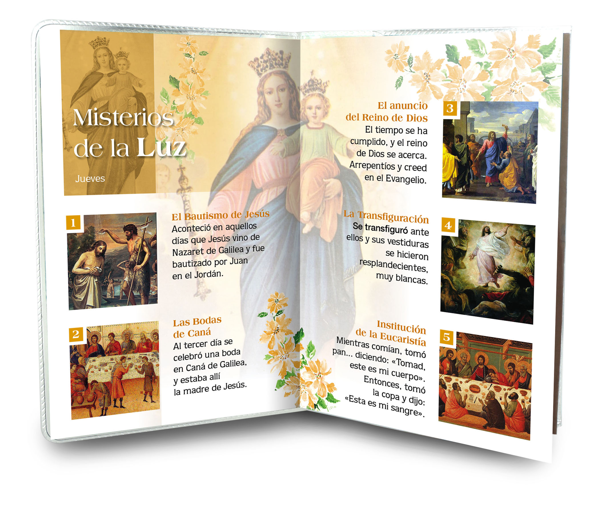 Il libretto, composto da 16 pagine, si presenta con una copertina in plastica trasparente e nell'interno vi è un piccolo rosario con i grani tipo perlina del diamero di mm 4.