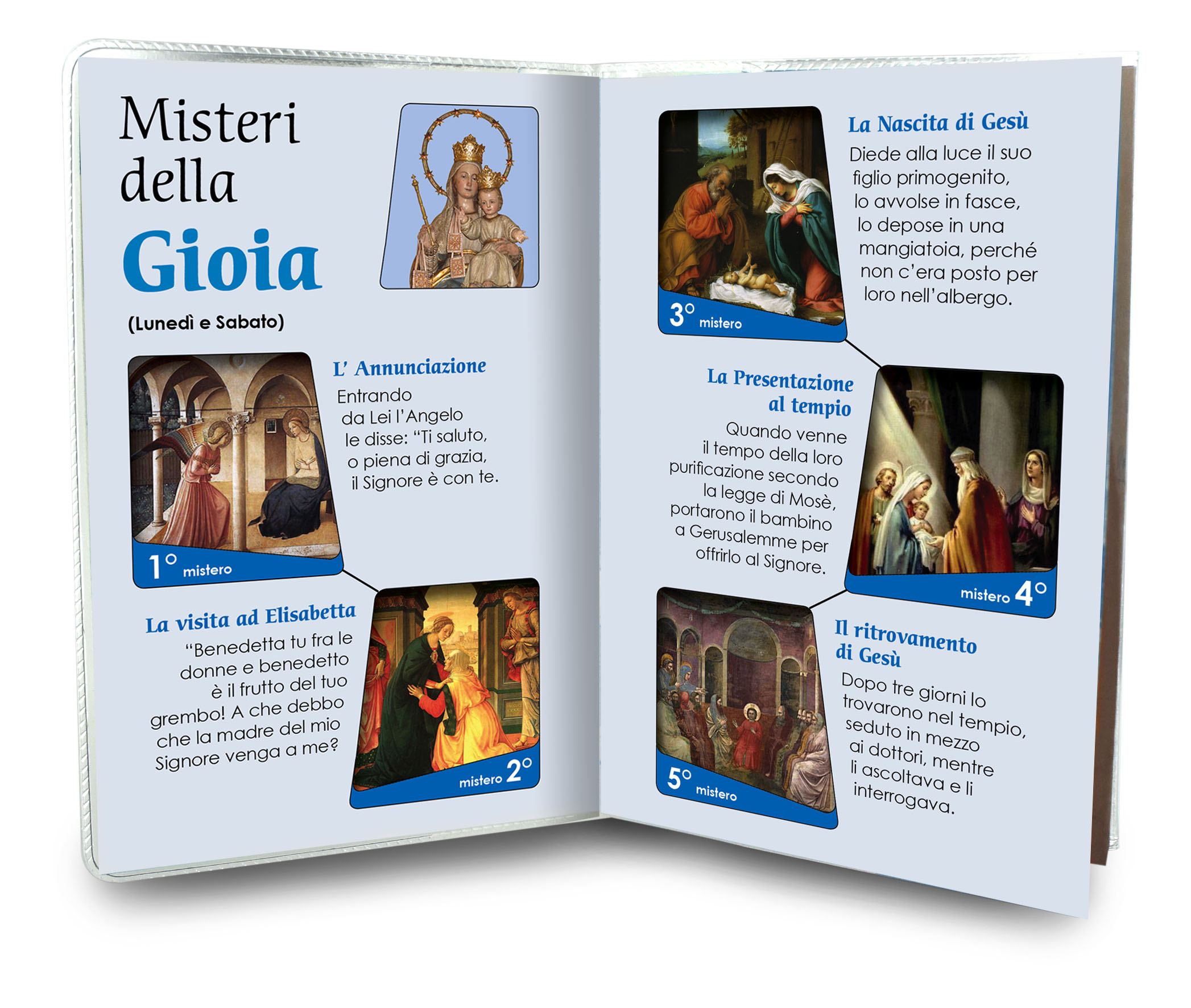 Il libretto, composto da 16 pagine, si presenta con una copertina in plastica trasparente e nell'interno vi è un piccolo rosario con i grani tipo perlina del diamero di mm 4.