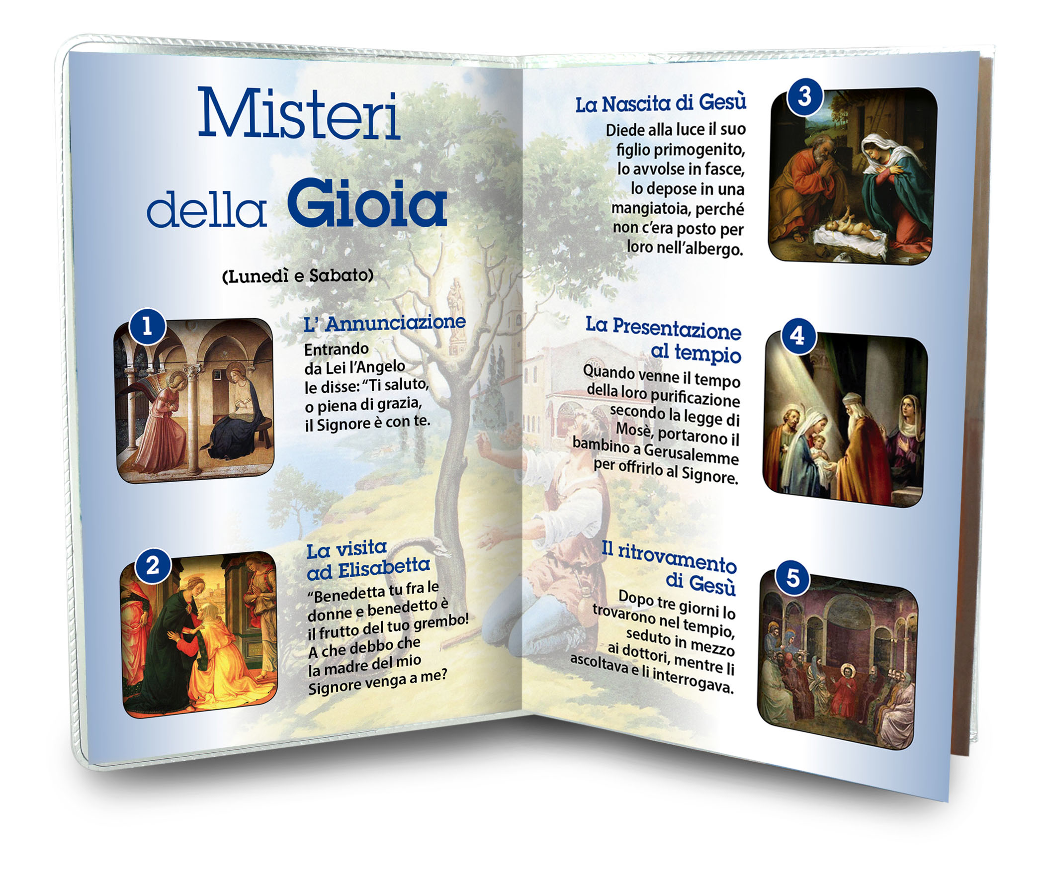Il libretto, composto da 16 pagine, si presenta con una copertina in plastica trasparente e nell'interno vi è un piccolo rosario con i grani tipo perlina del diamero di mm 4.