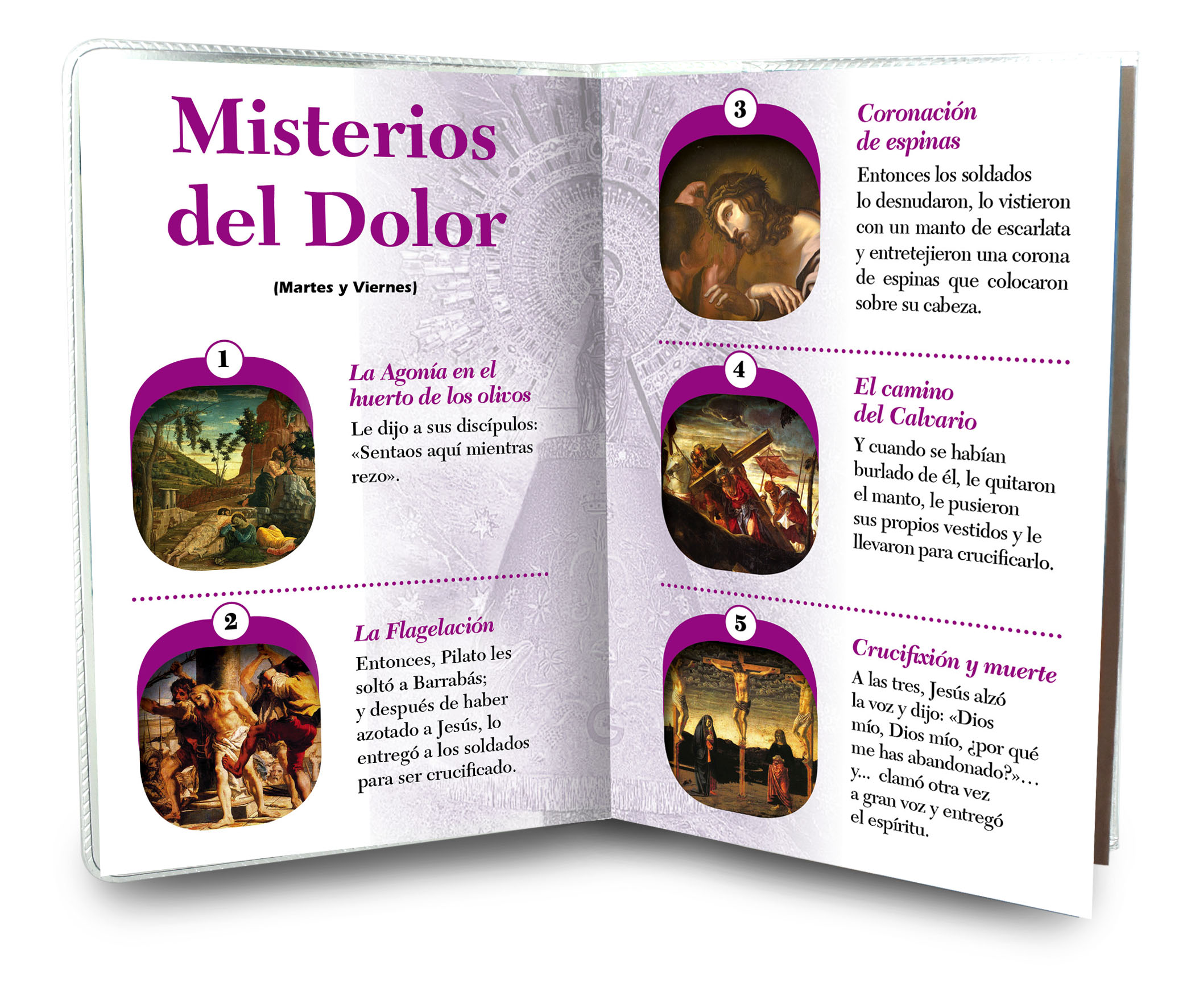 Il libretto, composto da 16 pagine, si presenta con una copertina in plastica trasparente e nell'interno vi è un piccolo rosario con i grani tipo perlina del diamero di mm 4.