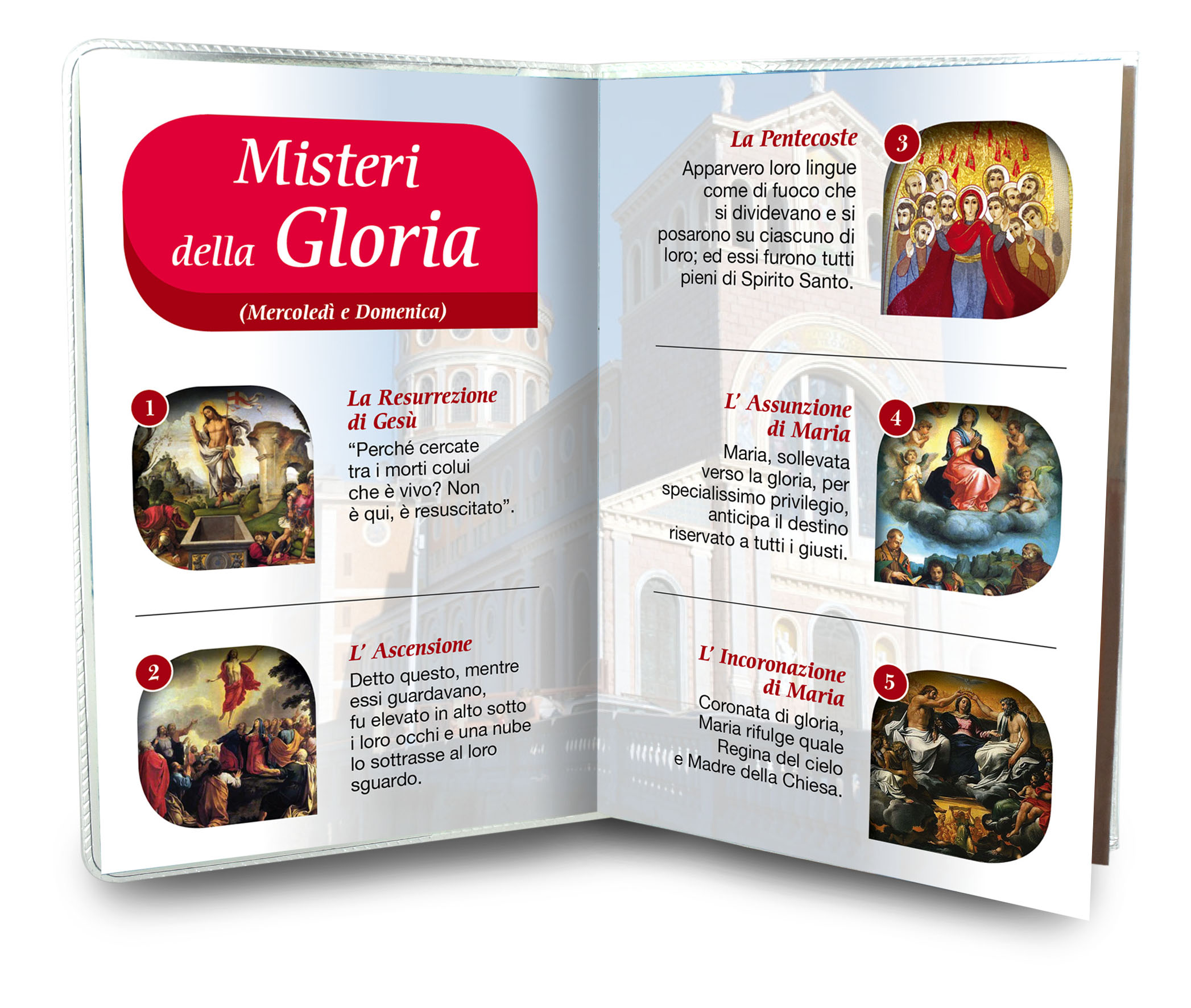 Il libretto, composto da 16 pagine, si presenta con una copertina in plastica trasparente e nell'interno vi è un piccolo rosario con i grani tipo perlina del diamero di mm 4.