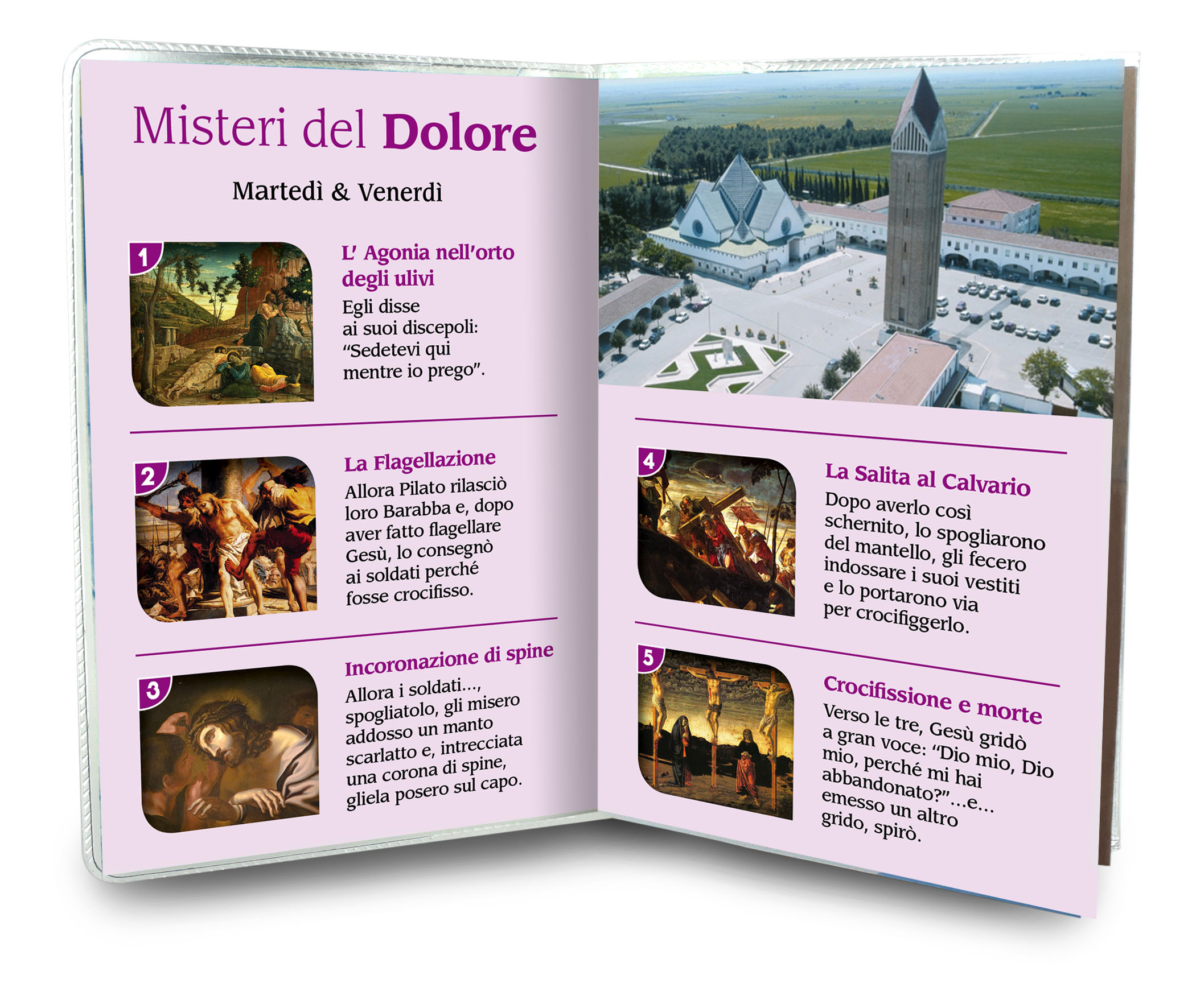 Il libretto, composto da 16 pagine, si presenta con una copertina in plastica trasparente e nell'interno vi è un piccolo rosario con i grani tipo perlina del diamero di mm 4.