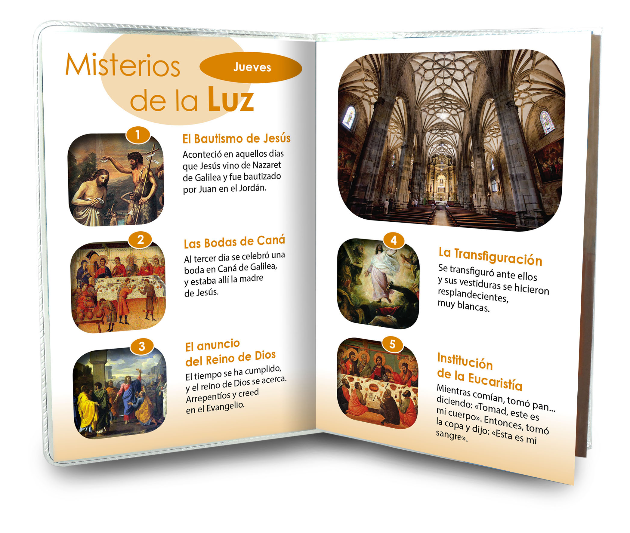 Il libretto, composto da 16 pagine, si presenta con una copertina in plastica trasparente e nell'interno vi è un piccolo rosario con i grani tipo perlina del diamero di mm 4.