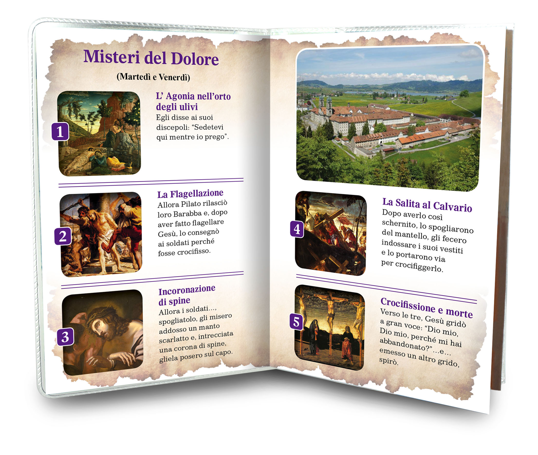 Il libretto, composto da 16 pagine, si presenta con una copertina in plastica trasparente e nell'interno vi è un piccolo rosario con i grani tipo perlina del diamero di mm 4.