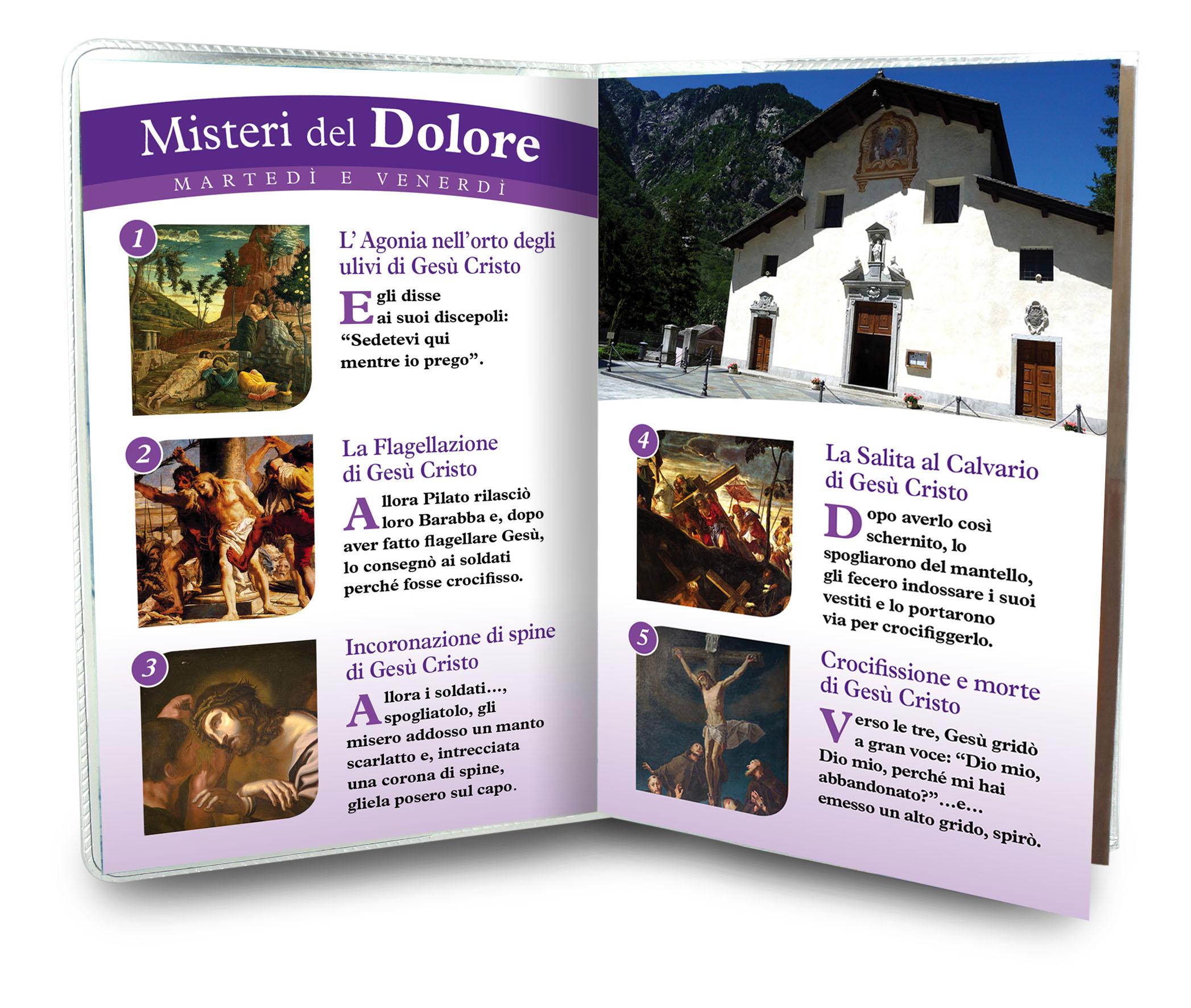 Il libretto, composto da 16 pagine, si presenta con una copertina in plastica trasparente e nell'interno vi è un piccolo rosario con i grani tipo perlina del diamero di mm 4.
