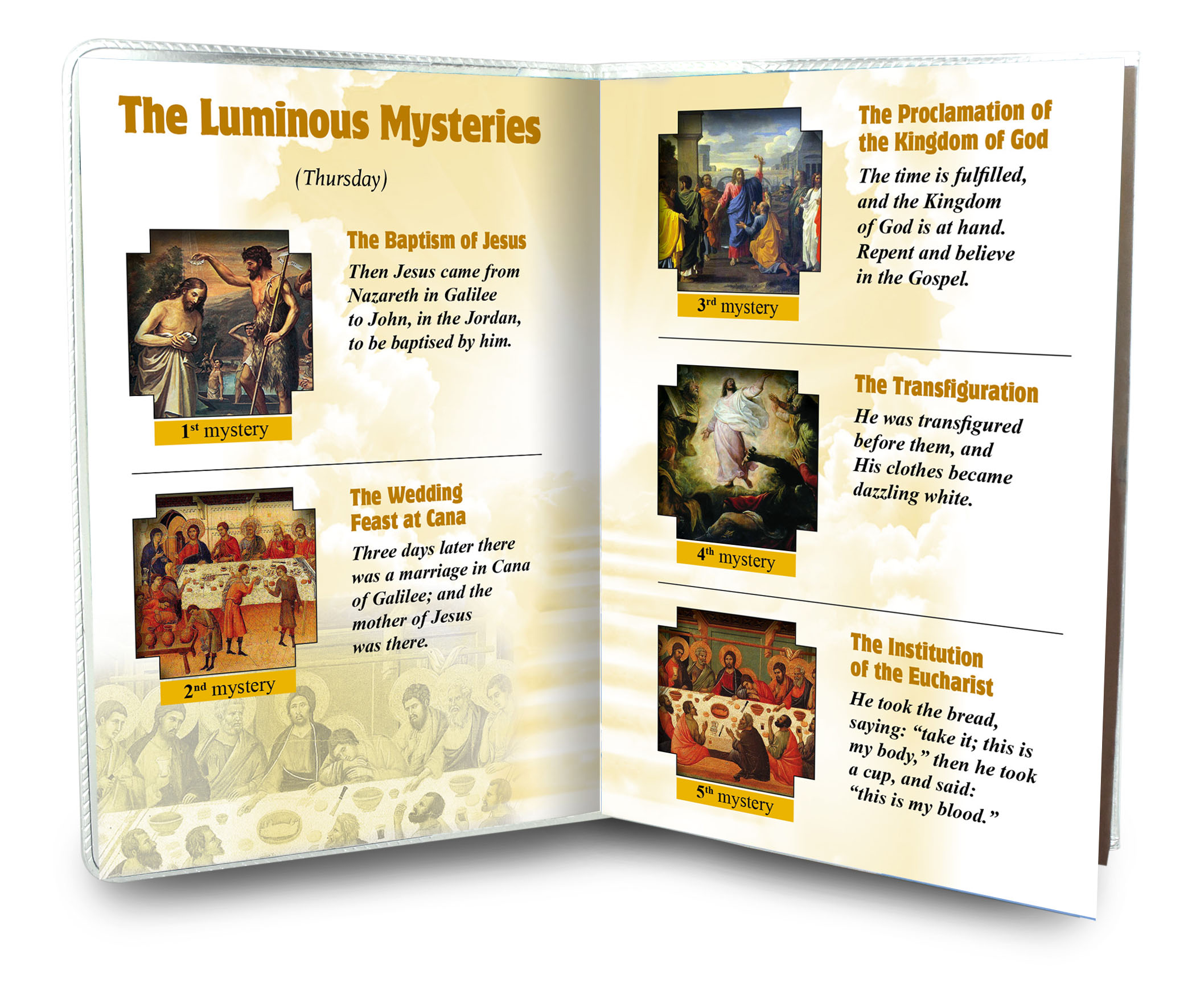 Il libretto, composto da 16 pagine, si presenta con una copertina in plastica trasparente e nell'interno vi è un piccolo rosario con i grani tipo perlina del diamero di mm 4.