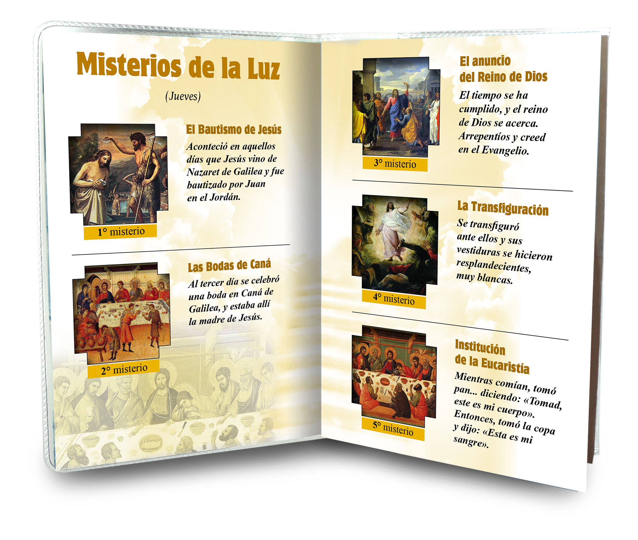 Il libretto, composto da 16 pagine, si presenta con una copertina in plastica trasparente e nell'interno vi è un piccolo rosario con i grani tipo perlina del diamero di mm 4.