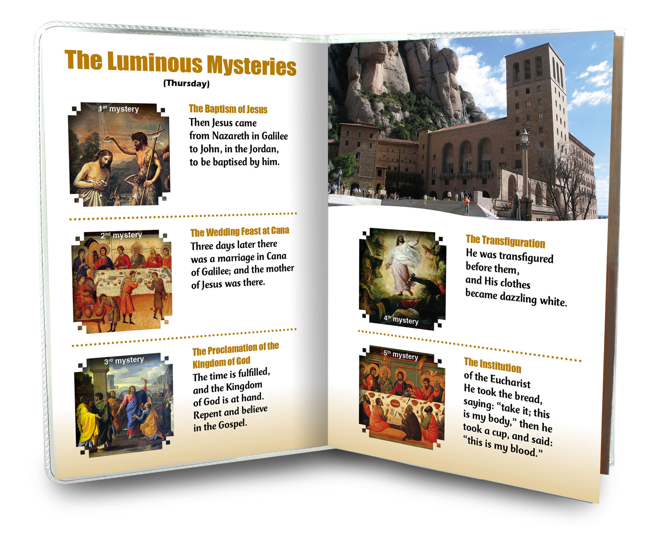 Il libretto, composto da 16 pagine, si presenta con una copertina in plastica trasparente e nell'interno vi è un piccolo rosario con i grani tipo perlina del diamero di mm 4.