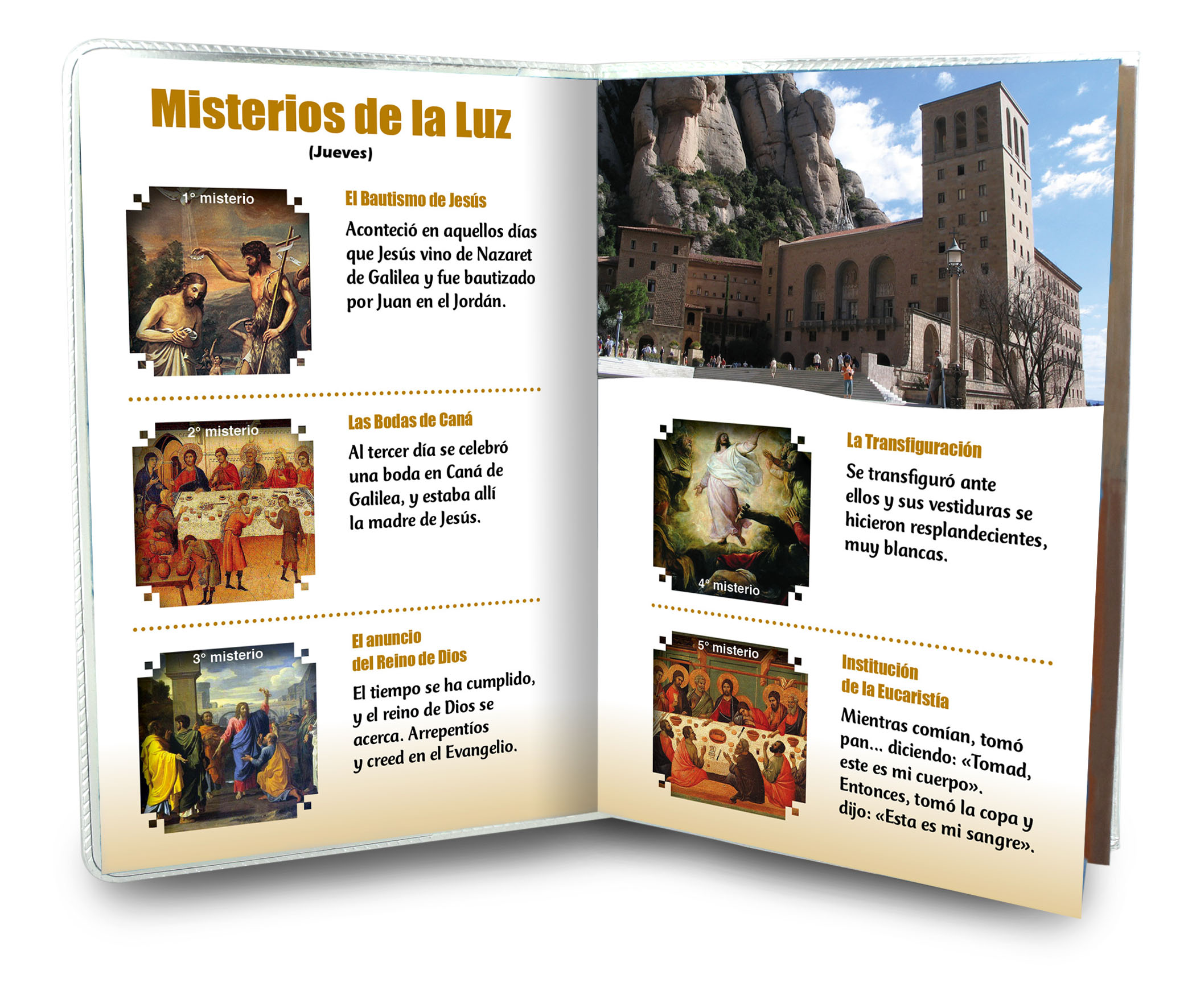 Il libretto, composto da 16 pagine, si presenta con una copertina in plastica trasparente e nell'interno vi è un piccolo rosario con i grani tipo perlina del diamero di mm 4.