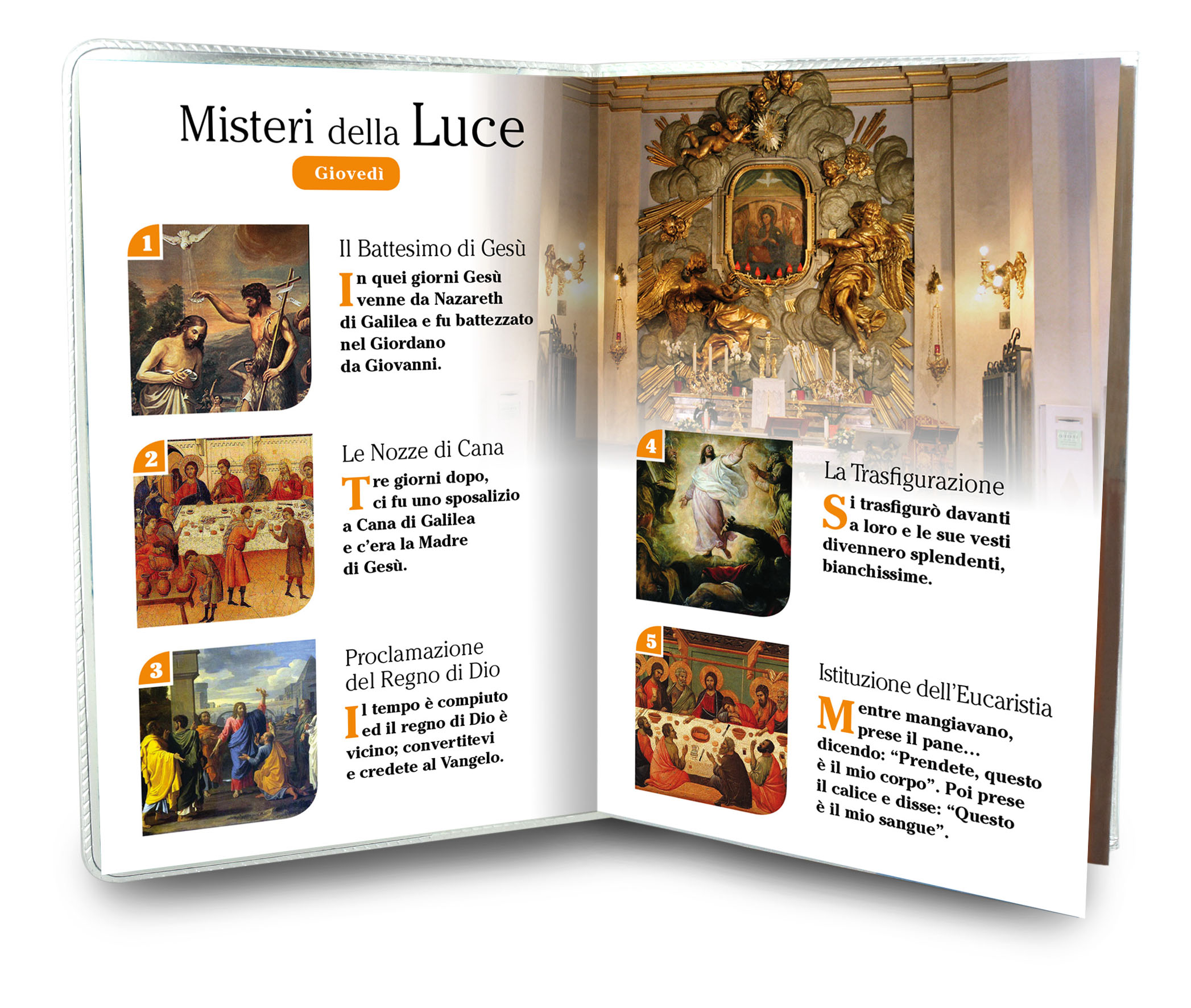 Il libretto, composto da 16 pagine, si presenta con una copertina in plastica trasparente e nell'interno vi è un piccolo rosario con i grani tipo perlina del diamero di mm 4.