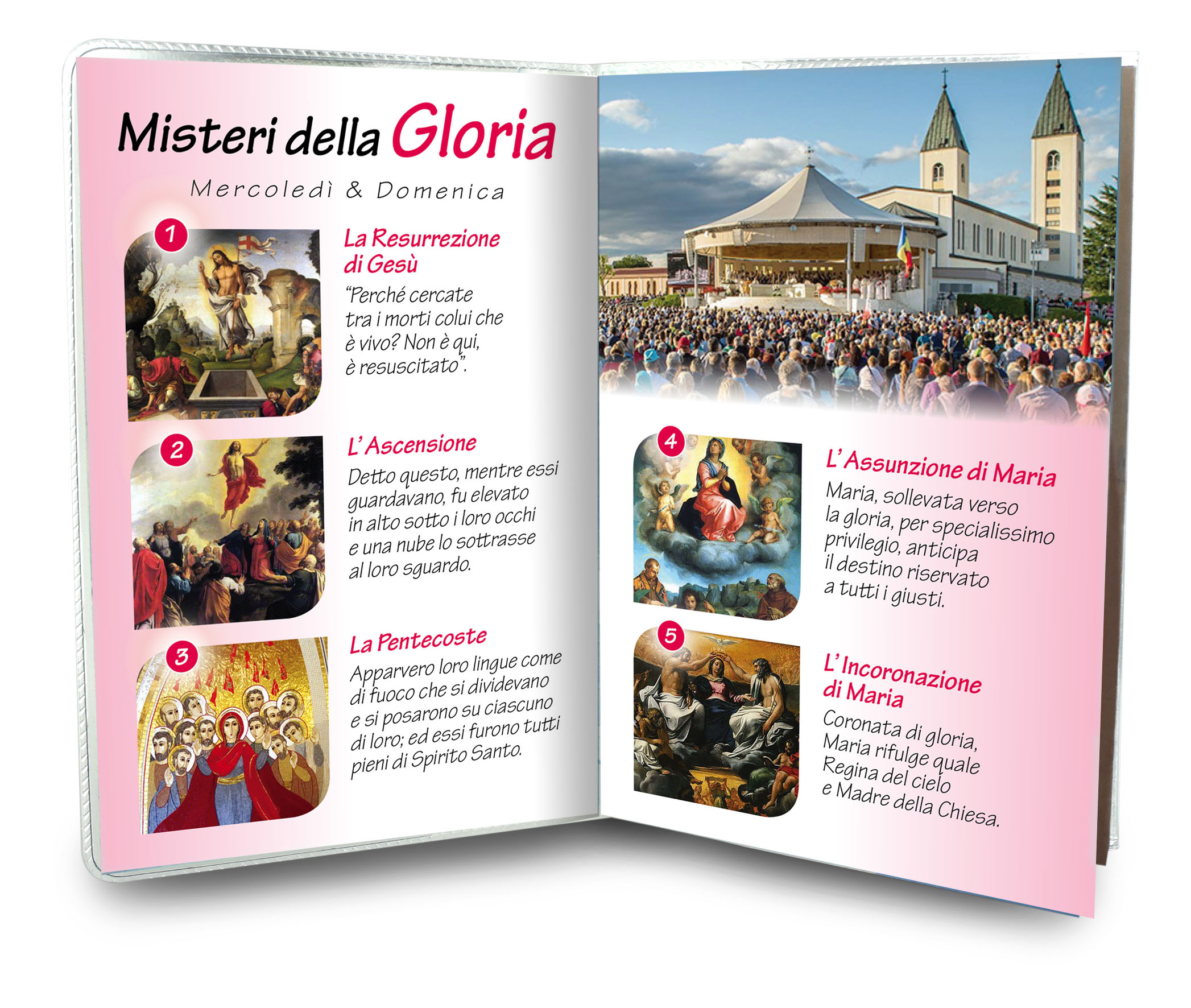 Il libretto, composto da 16 pagine, si presenta con una copertina in plastica trasparente e nell'interno vi è un piccolo rosario con i grani tipo perlina del diamero di mm 4.