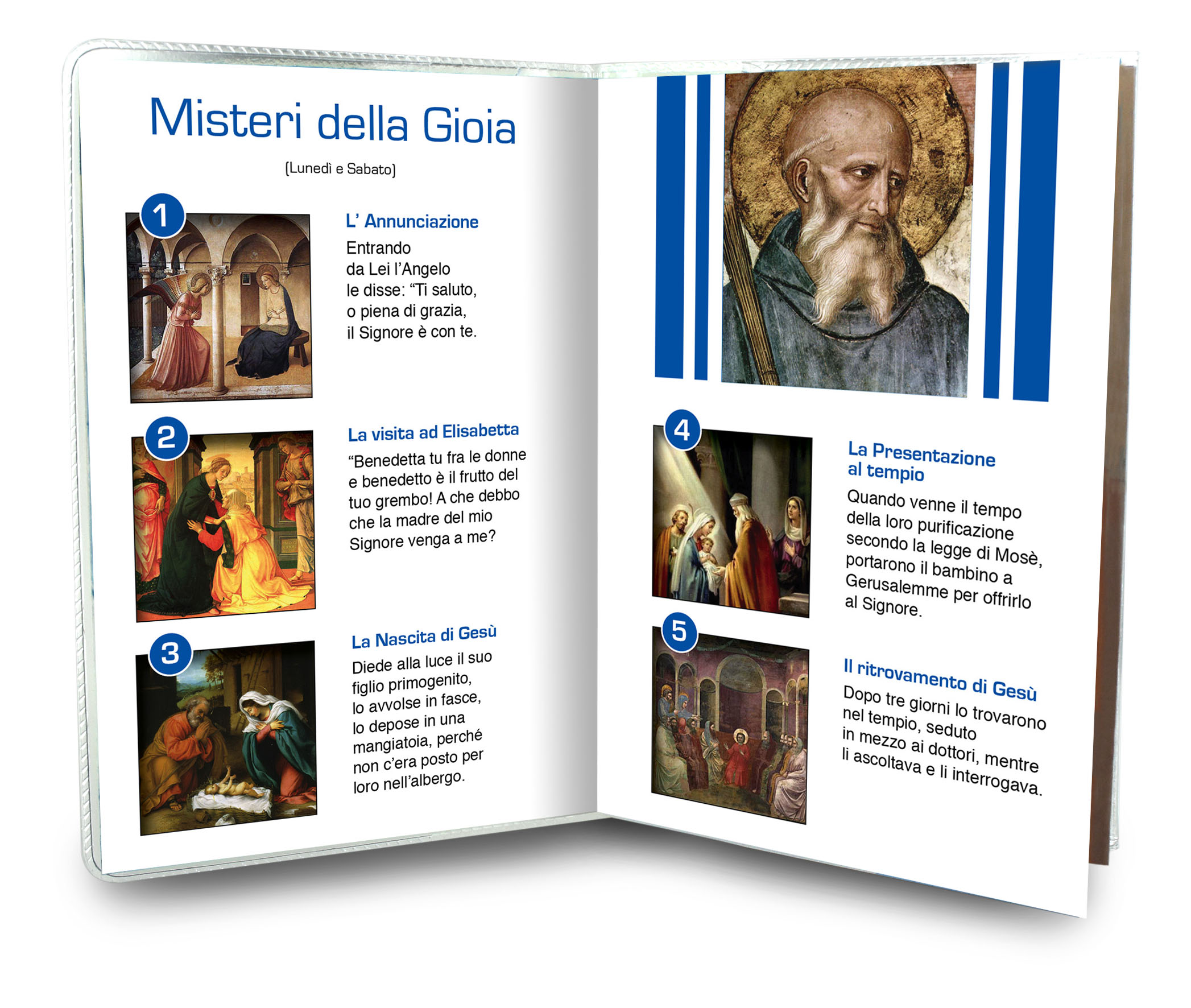 Il libretto, composto da 12 pagine, si presenta con una copertina in plastica trasparente e nell'interno vi è un piccolo rosario con i grani tipo perlina del diamero di mm 4.