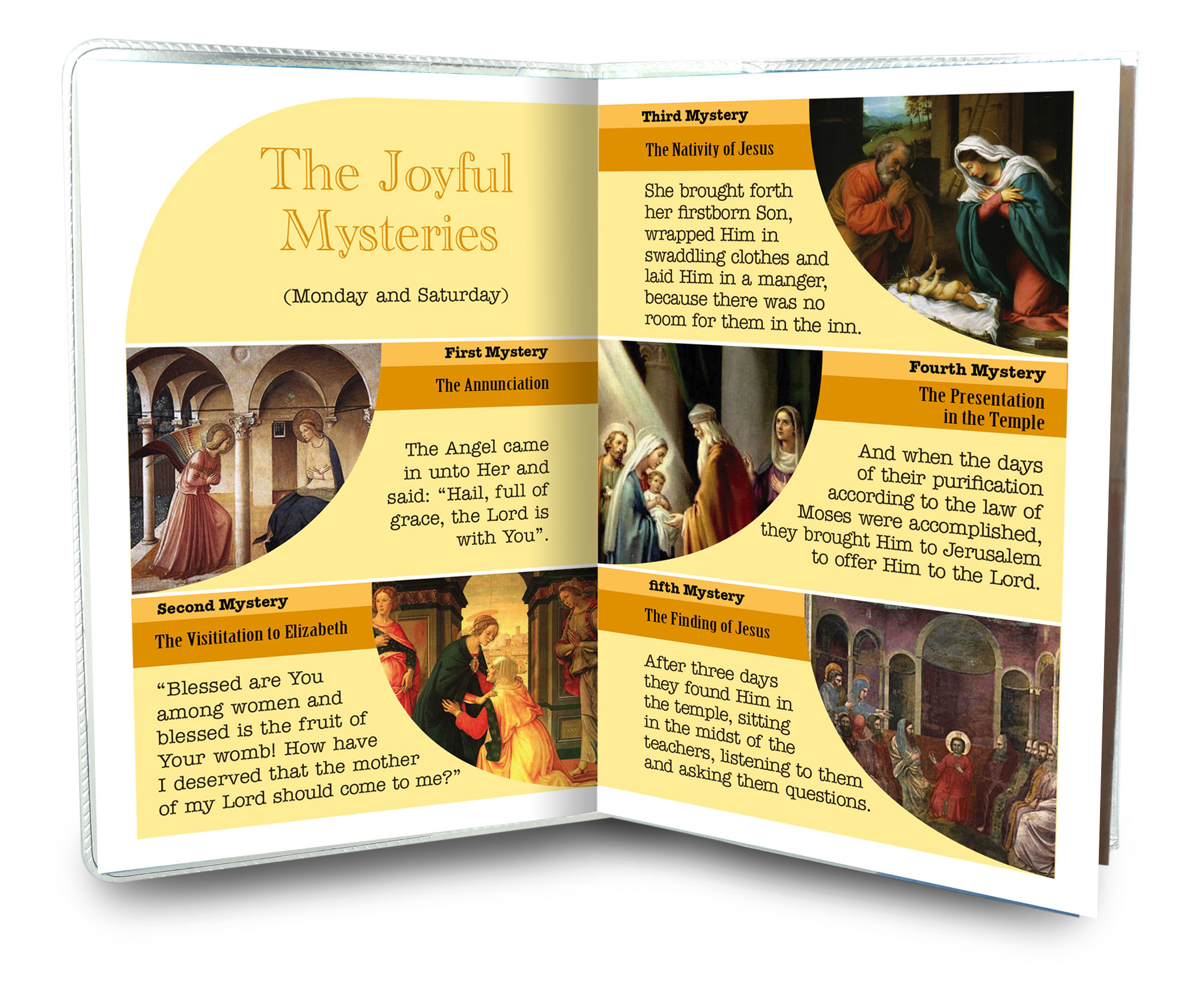 Il libretto, composto da 16 pagine, si presenta con una copertina in plastica trasparente e nell'interno vi è un piccolo rosario con i grani tipo perlina del diamero di mm 4.