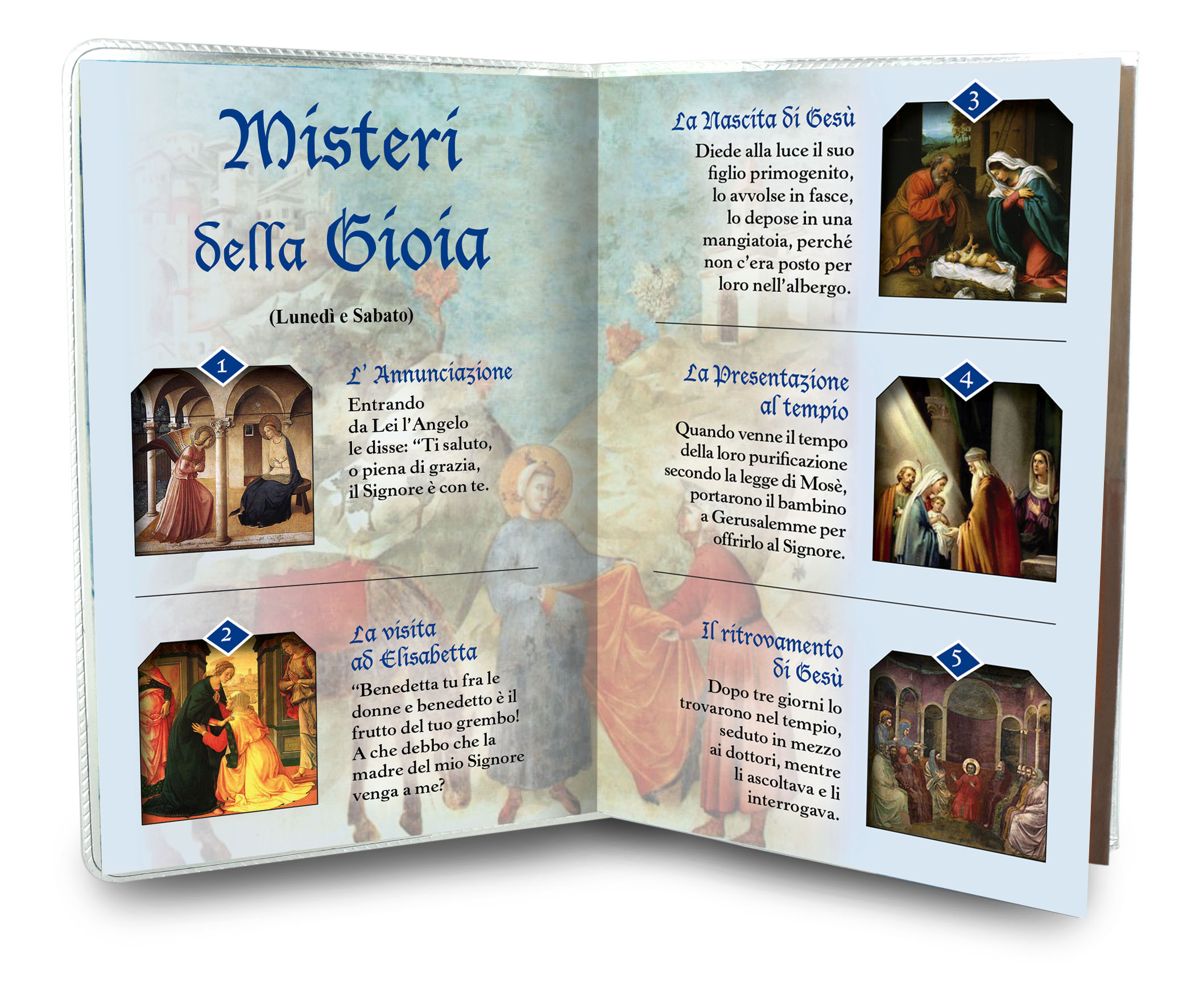 Il libretto, composto da 16 pagine, si presenta con una copertina in plastica trasparente e nell'interno vi è un piccolo rosario con i grani tipo perlina del diamero di mm 4.