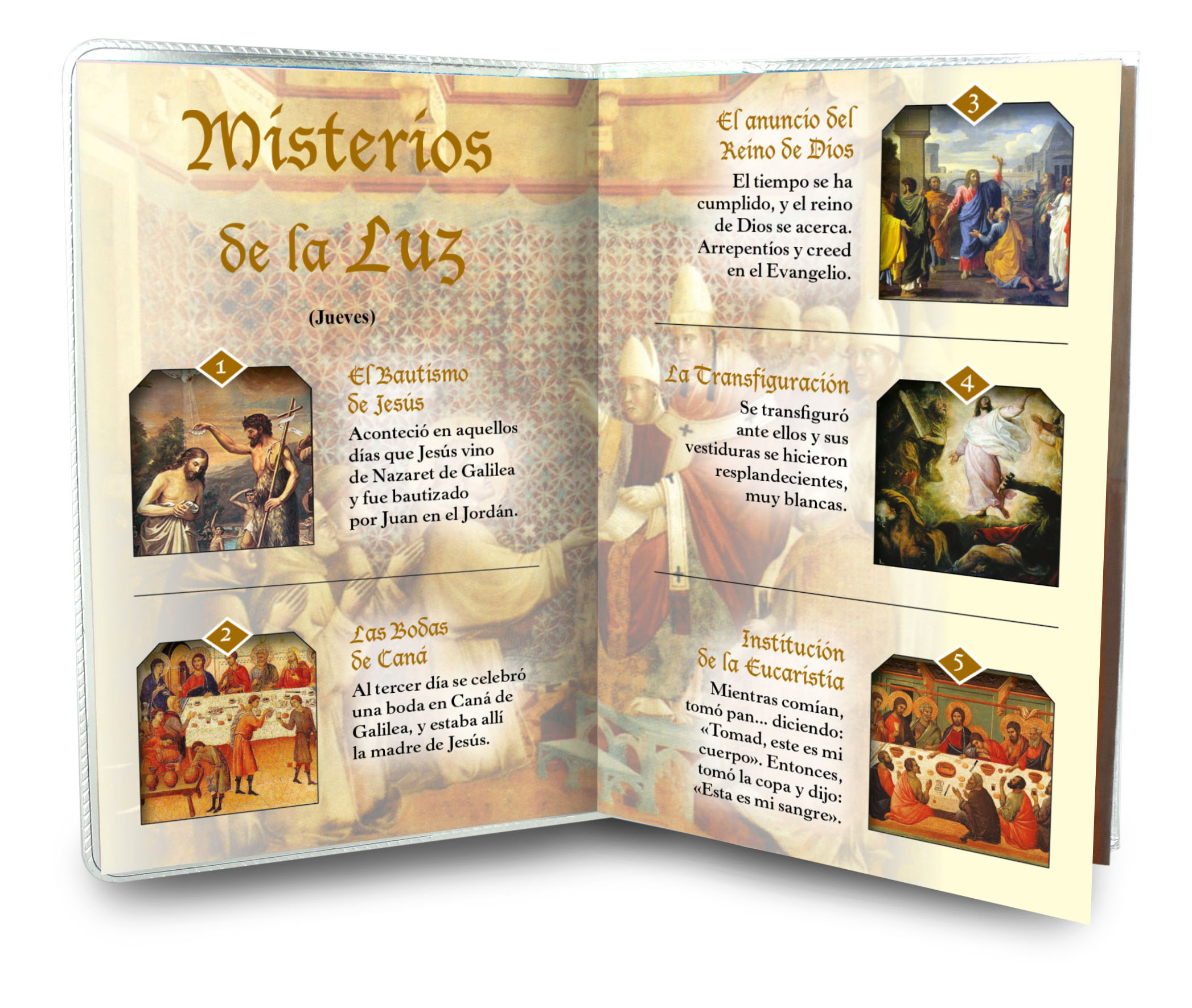 Il libretto, composto da 16 pagine, si presenta con una copertina in plastica trasparente e nell'interno vi è un piccolo rosario con i grani tipo perlina del diamero di mm 4.