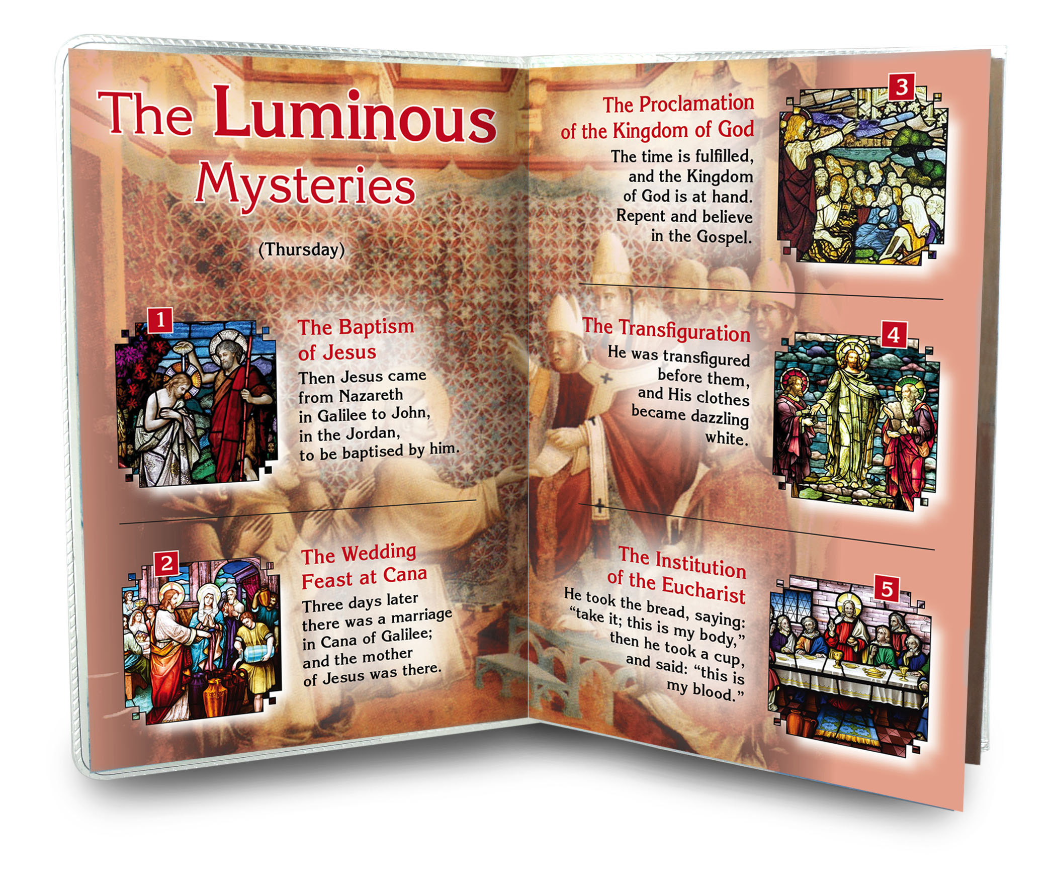 Il libretto, composto da 16 pagine, si presenta con una copertina in plastica trasparente e nell'interno vi è un piccolo rosario con i grani tipo perlina del diamero di mm 4.