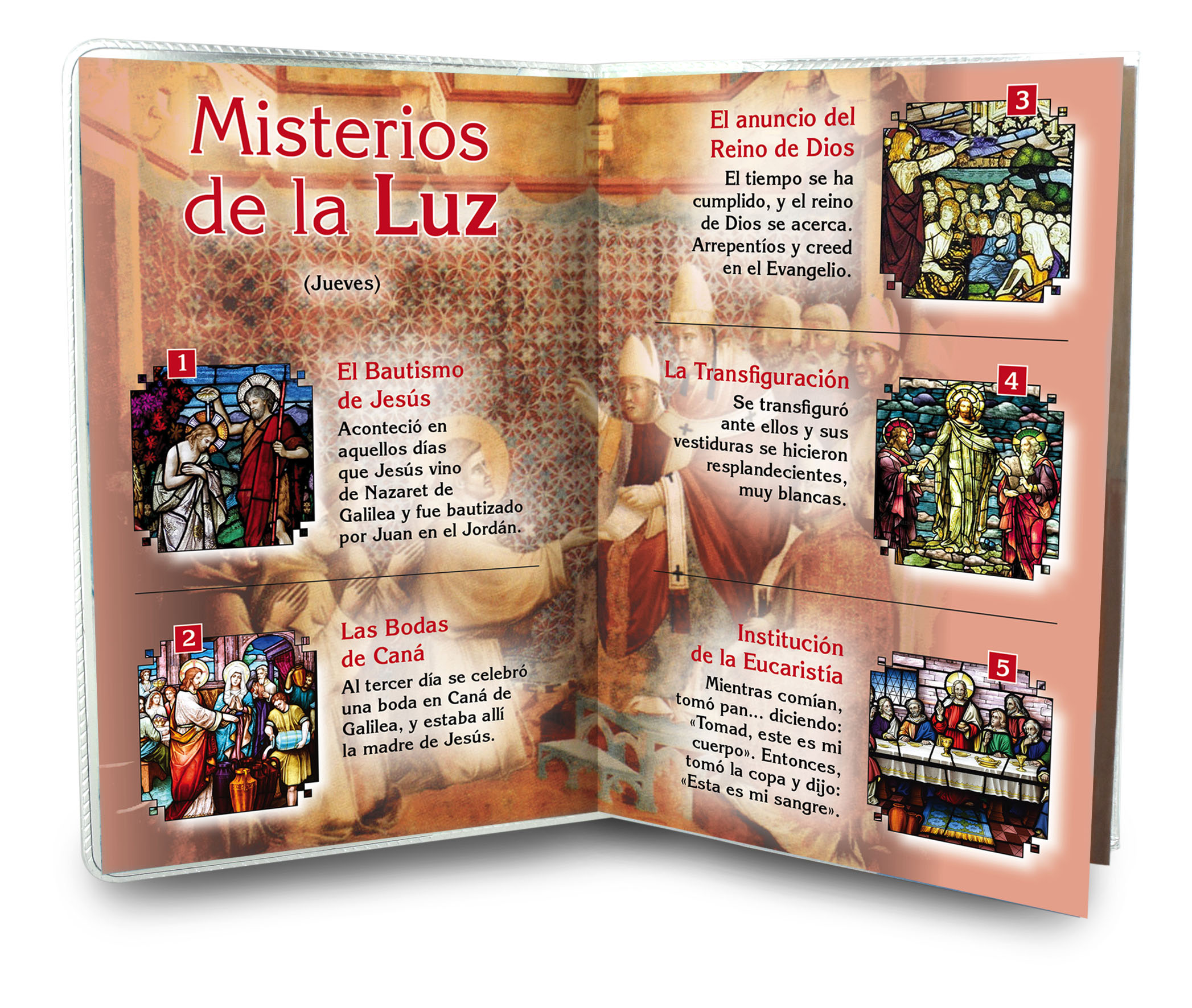 Il libretto, composto da 16 pagine, si presenta con una copertina in plastica trasparente e nell'interno vi è un piccolo rosario con i grani tipo perlina del diamero di mm 4.