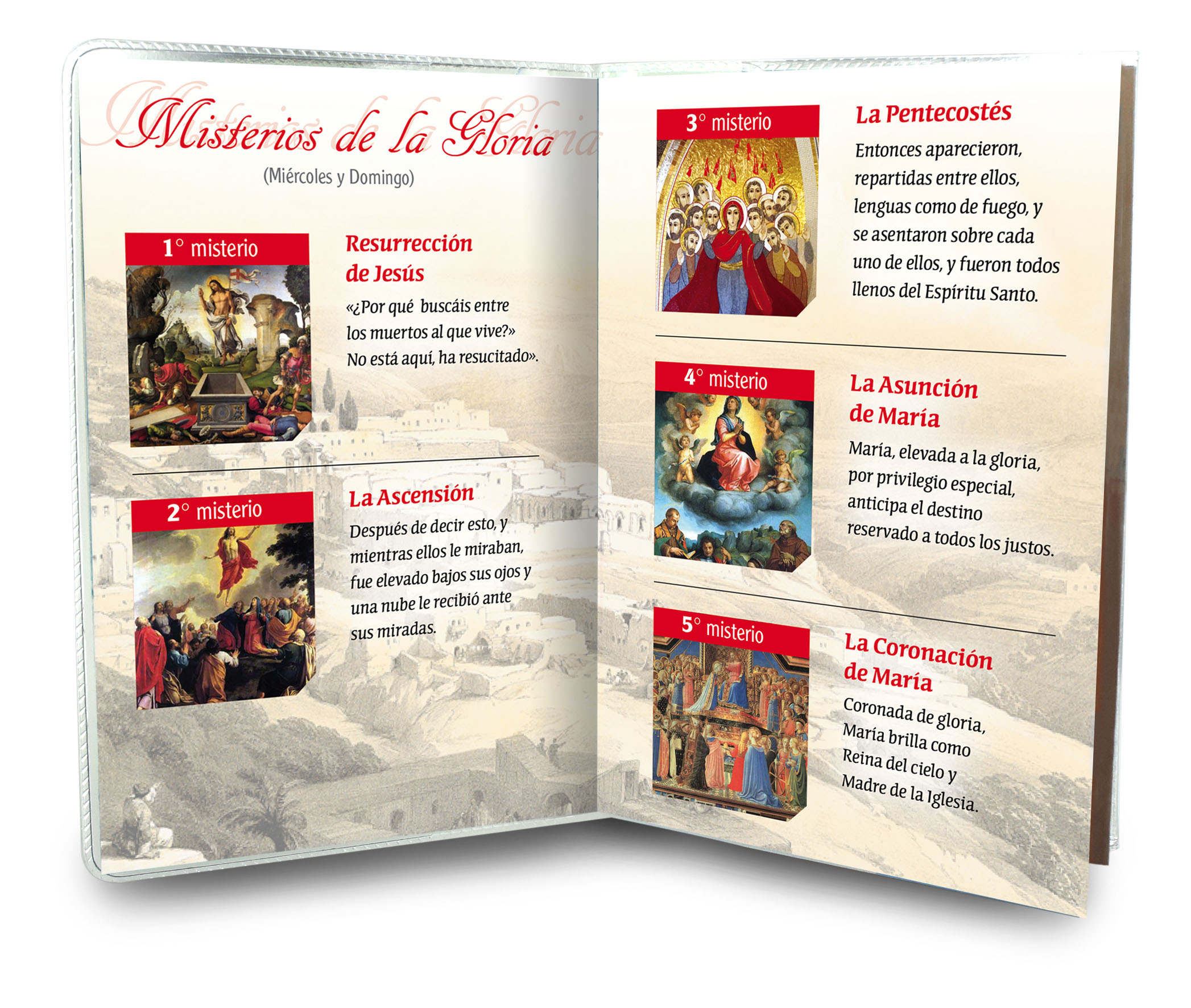Il libretto, composto da 16 pagine, si presenta con una copertina in plastica trasparente e nell'interno vi è un piccolo rosario con i grani tipo perlina del diamero di mm 4.