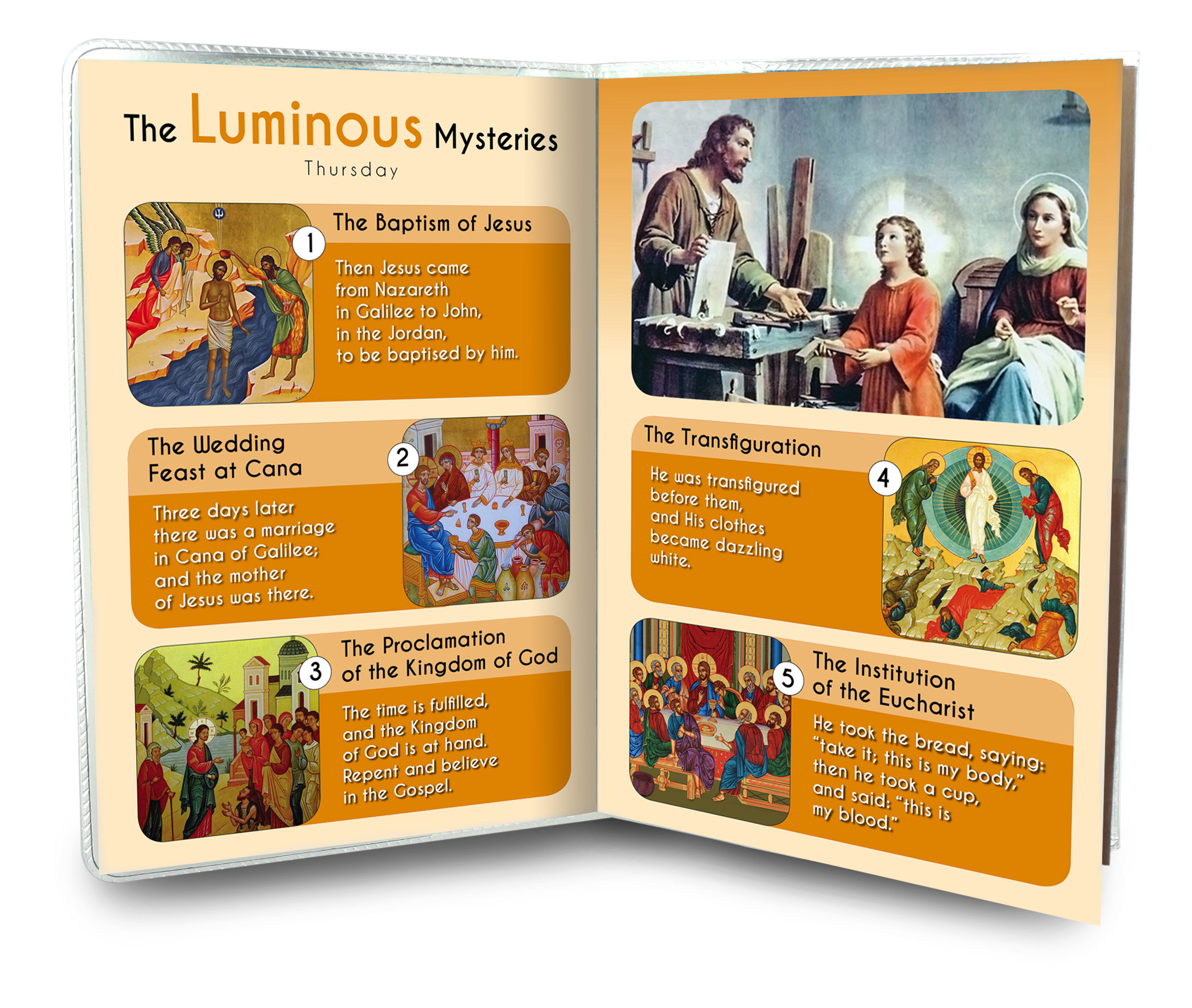 Il libretto, composto da 16 pagine, si presenta con una copertina in plastica trasparente e nell'interno vi è un piccolo rosario con i grani tipo perlina del diamero di mm 4.