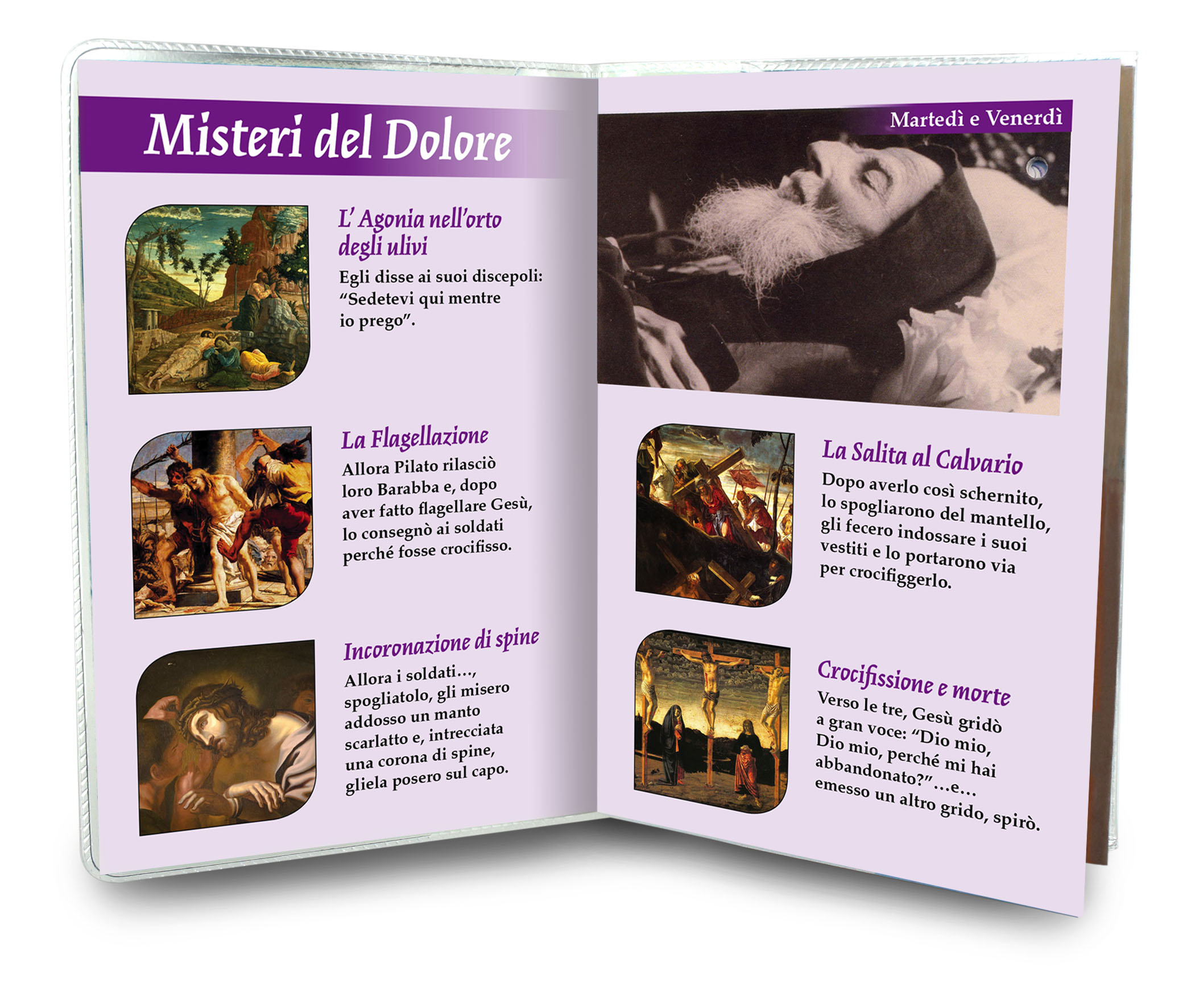 Il libretto, composto da 16 pagine, si presenta con una copertina in plastica trasparente e nell'interno vi è un piccolo rosario con i grani tipo perlina del diamero di mm 4.