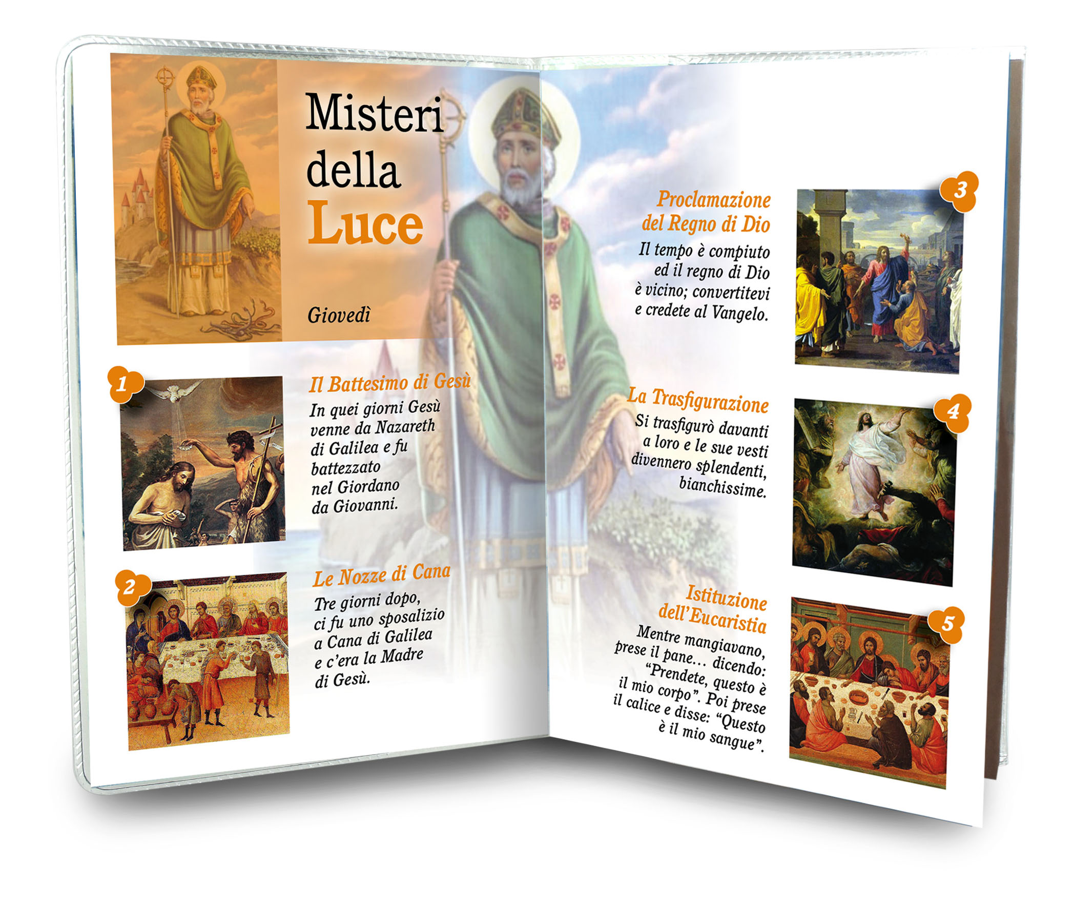 Il libretto, composto da 16 pagine, si presenta con una copertina in plastica trasparente e nell'interno vi è un piccolo rosario con i grani tipo perlina del diamero di mm 4.