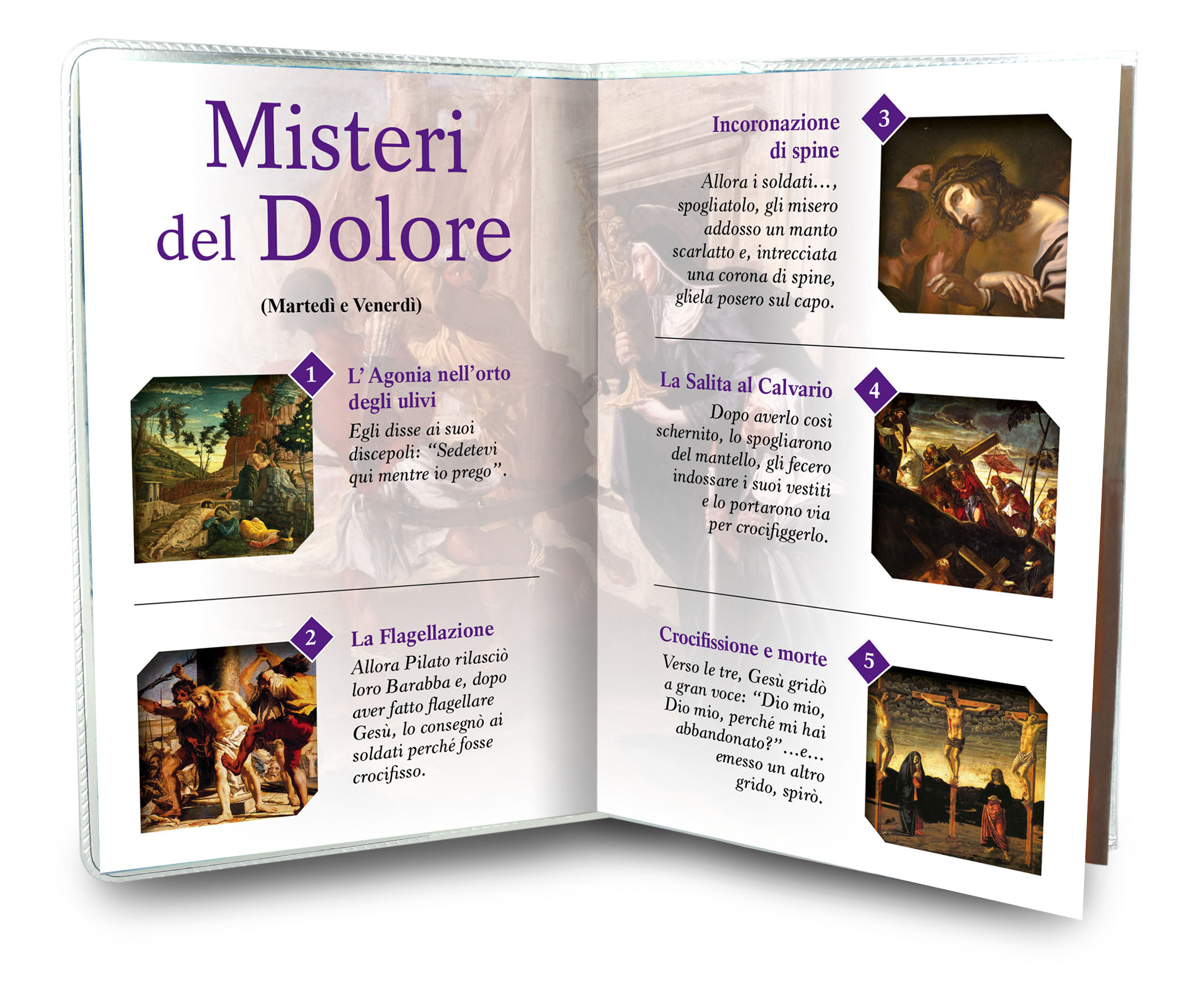 Il libretto, composto da 16 pagine, si presenta con una copertina in plastica trasparente e nell'interno vi è un piccolo rosario con i grani tipo perlina del diamero di mm 4.