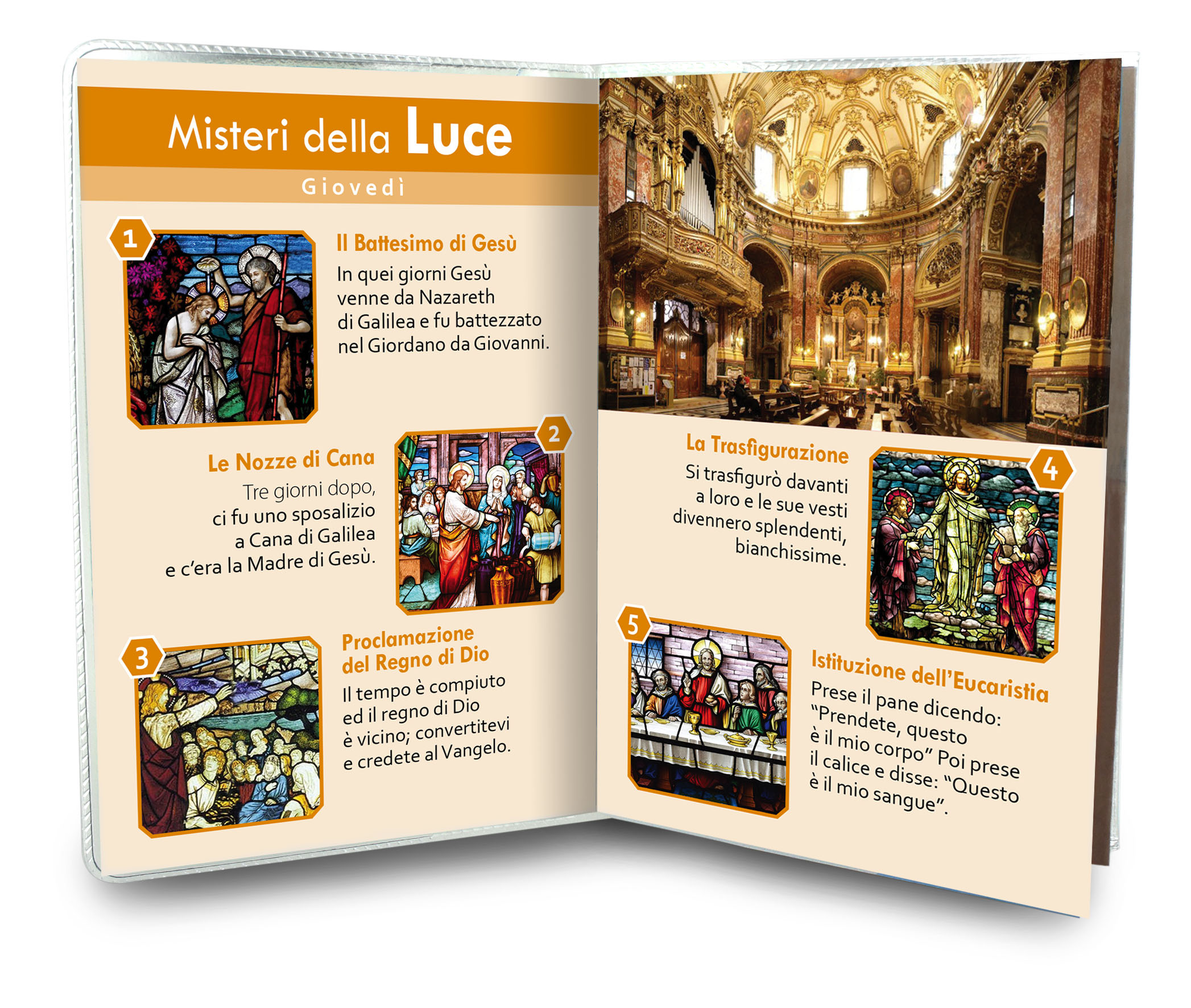 Il libretto, composto da 16 pagine, si presenta con una copertina in plastica trasparente e nell'interno vi è un piccolo rosario con i grani tipo perlina del diamero di mm 4.