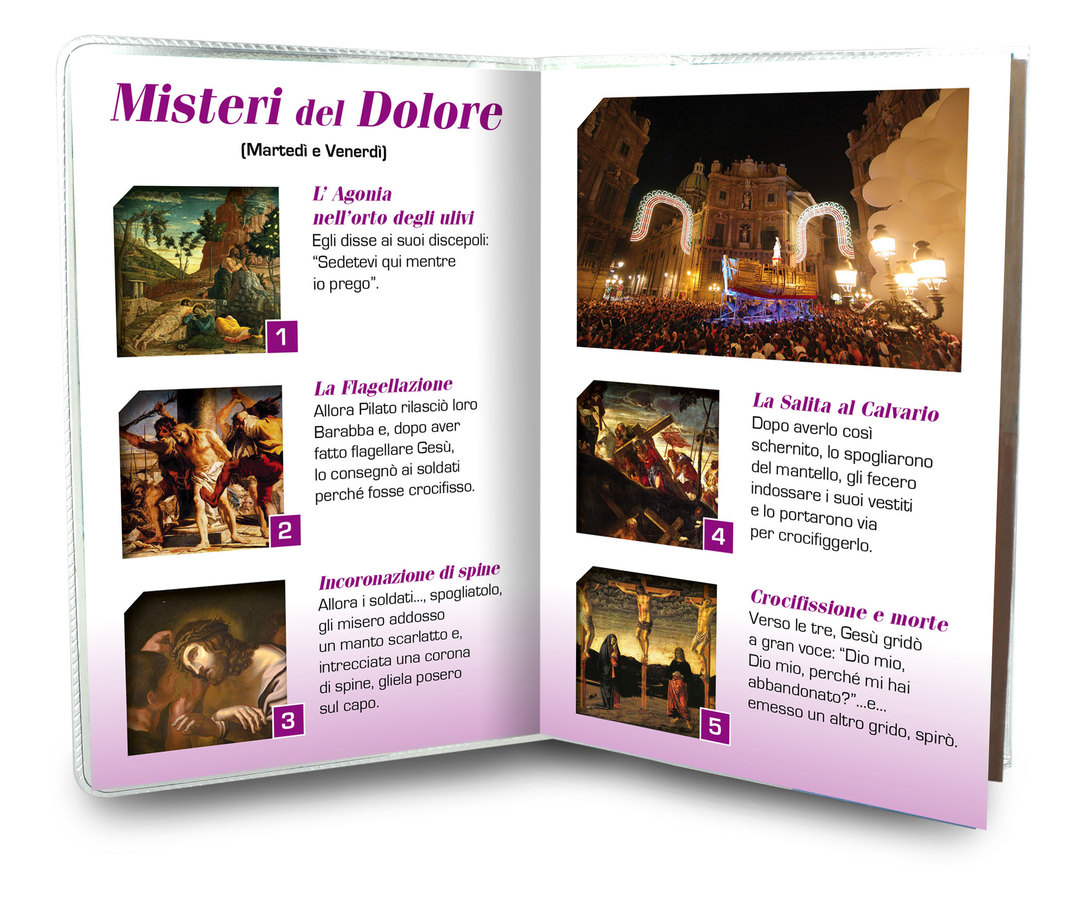 Il libretto, composto da 16 pagine, si presenta con una copertina in plastica trasparente e nell'interno vi è un piccolo rosario con i grani tipo perlina del diamero di mm 4.