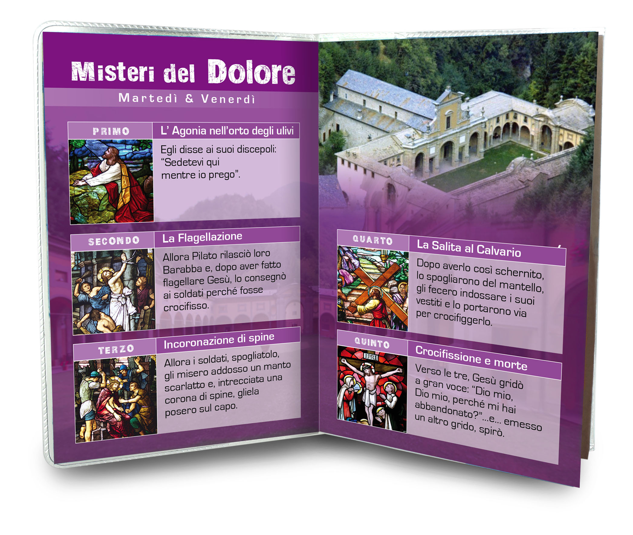 Il libretto, composto da 16 pagine, si presenta con una copertina in plastica trasparente e nell'interno vi è un piccolo rosario con i grani tipo perlina del diamero di mm 4.