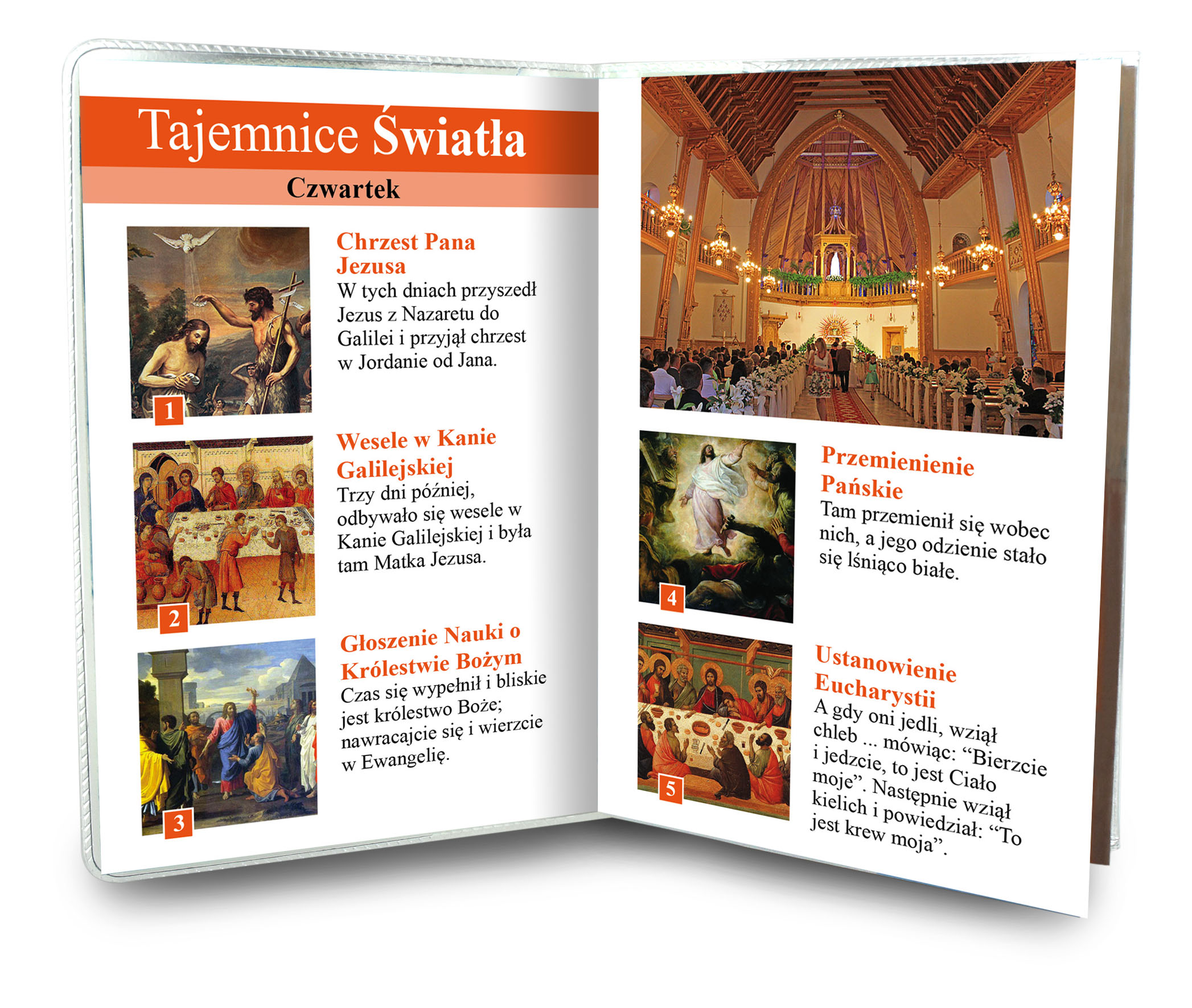 Il libretto, composto da 16 pagine, si presenta con una copertina in plastica trasparente e nell'interno vi è un piccolo rosario con i grani tipo perlina del diamero di mm 4.