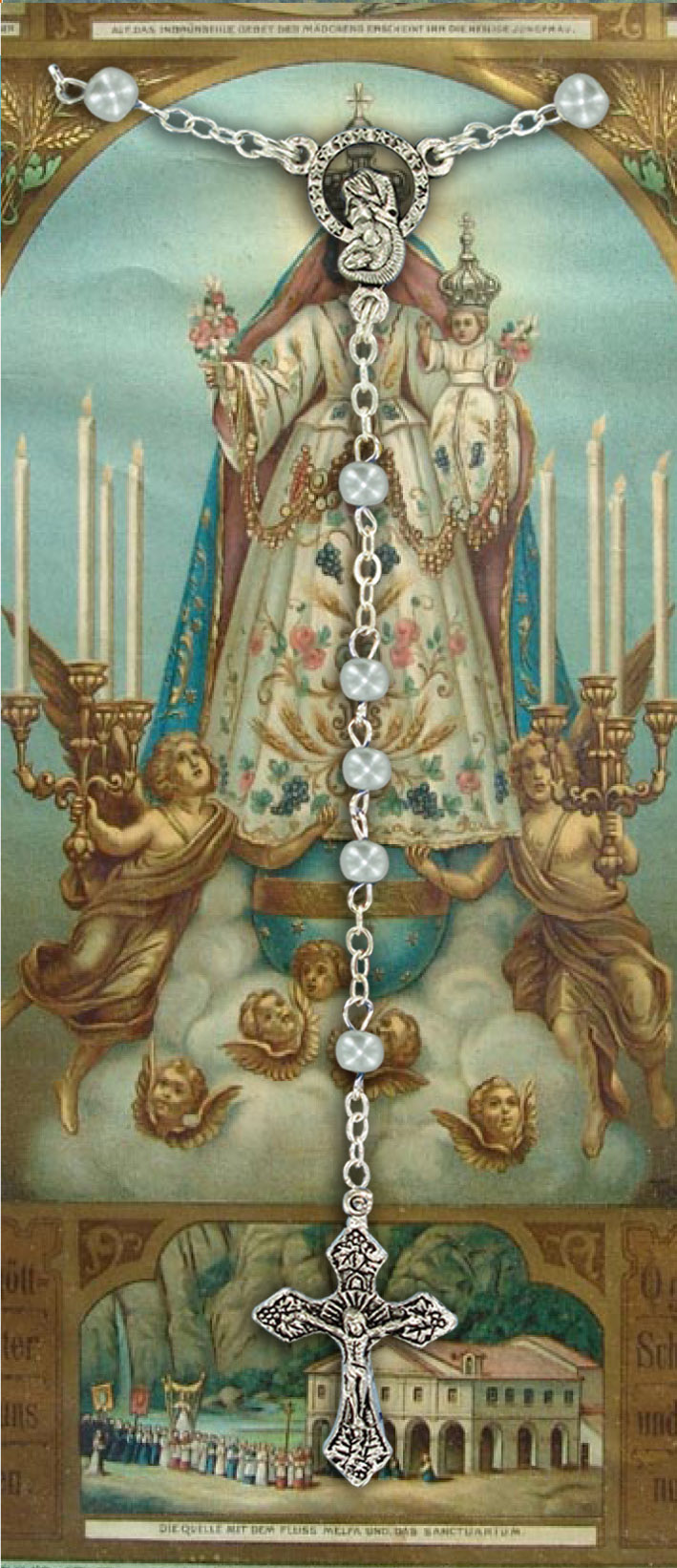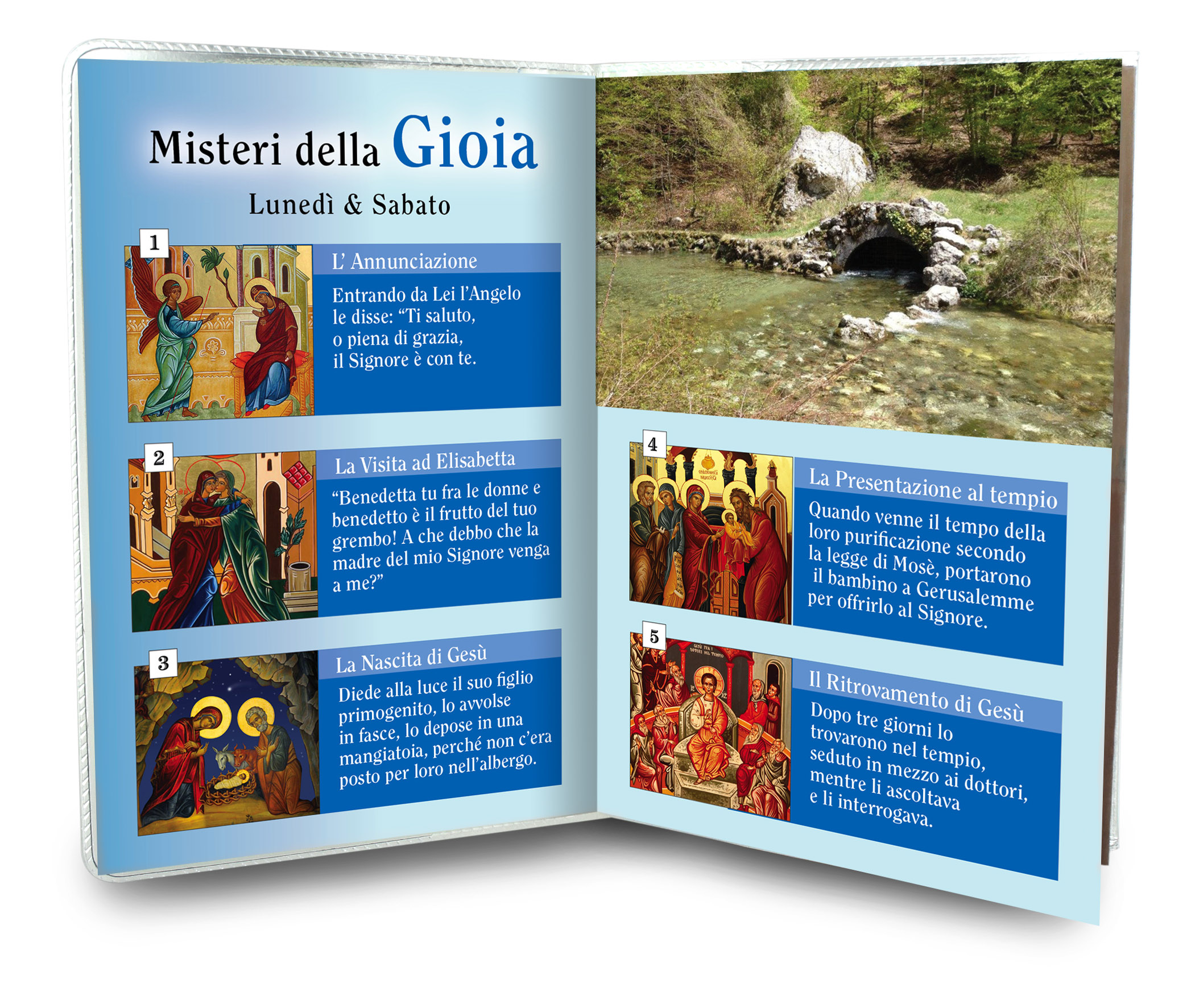 Il libretto, composto da 16 pagine, si presenta con una copertina in plastica trasparente e nell'interno vi è un piccolo rosario con i grani tipo perlina del diamero di mm 4.